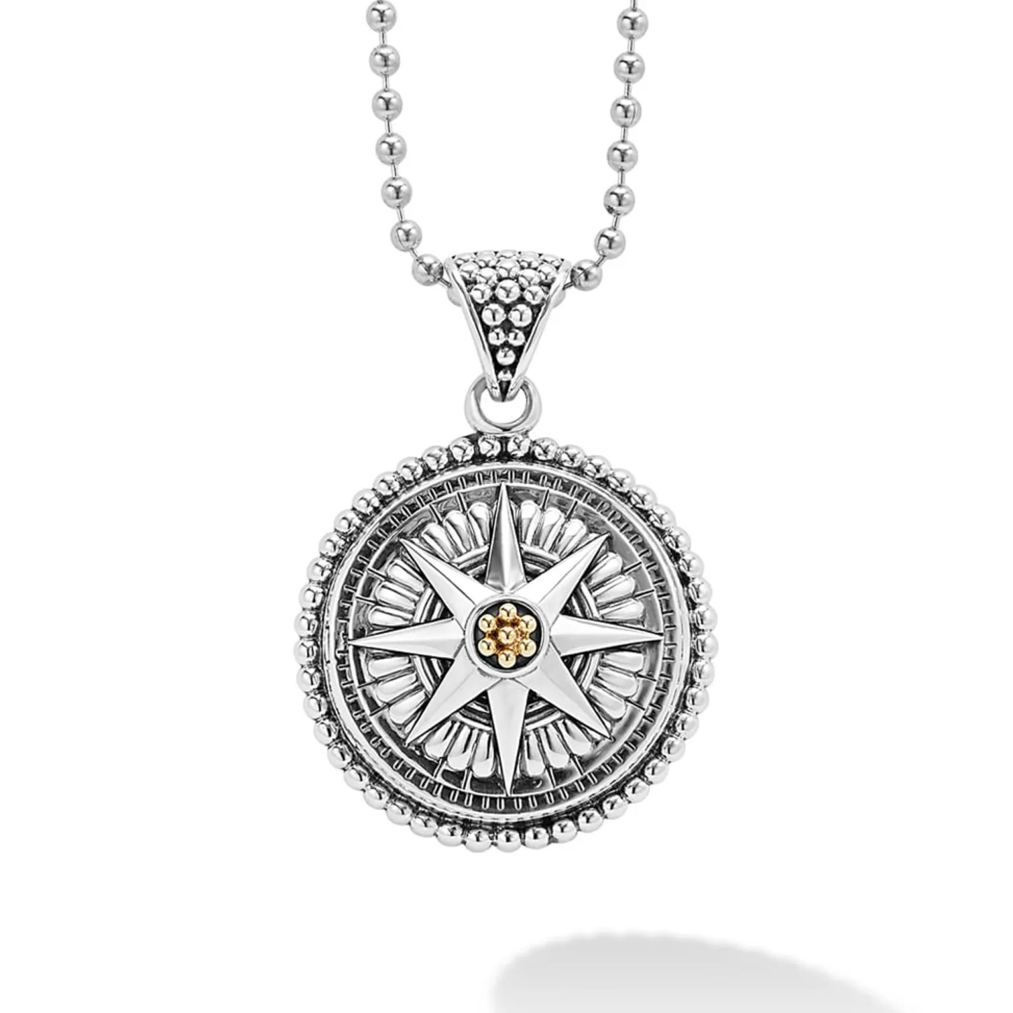 A Signature Lagos Compass. Sterling Silver And 18K Gold With Fluting And Caviar Beading Forms This Compass Pendant.