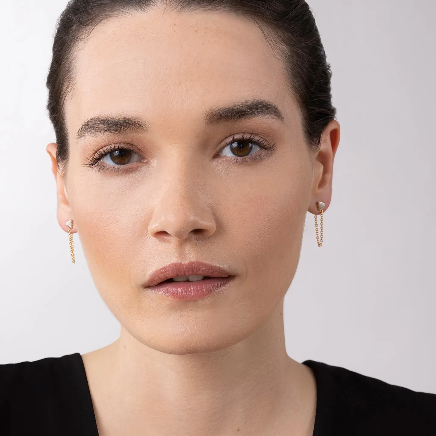 The Convertible Chain Earrings Featuring A Diamond Pyramid With An 18K Gold Chain That Offers Three Different Ways To Wear: Drop, Hook Chain On Same Ear Piercing, And Hook Chain On Different Ear Piercing.