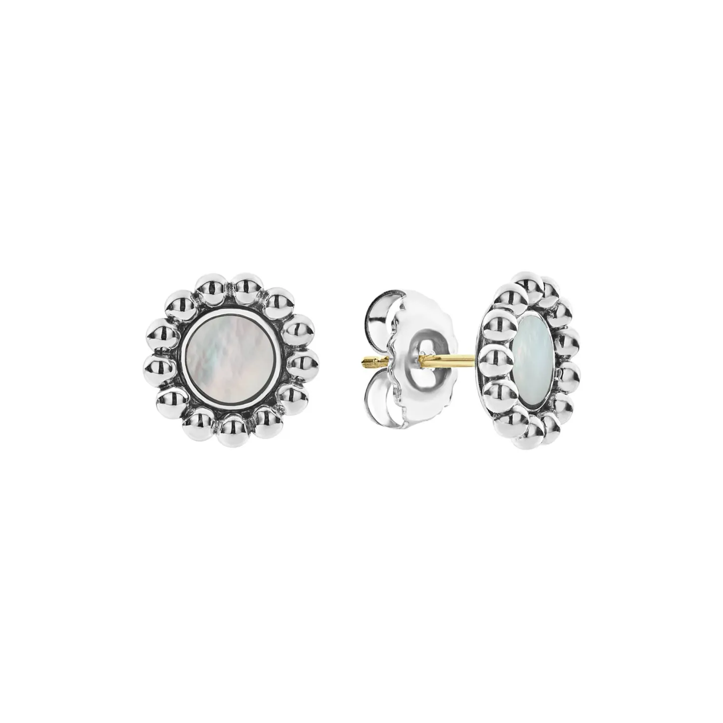 Mother Of Pearl Gemstone Circle Earrings Framed By Caviar Beading.