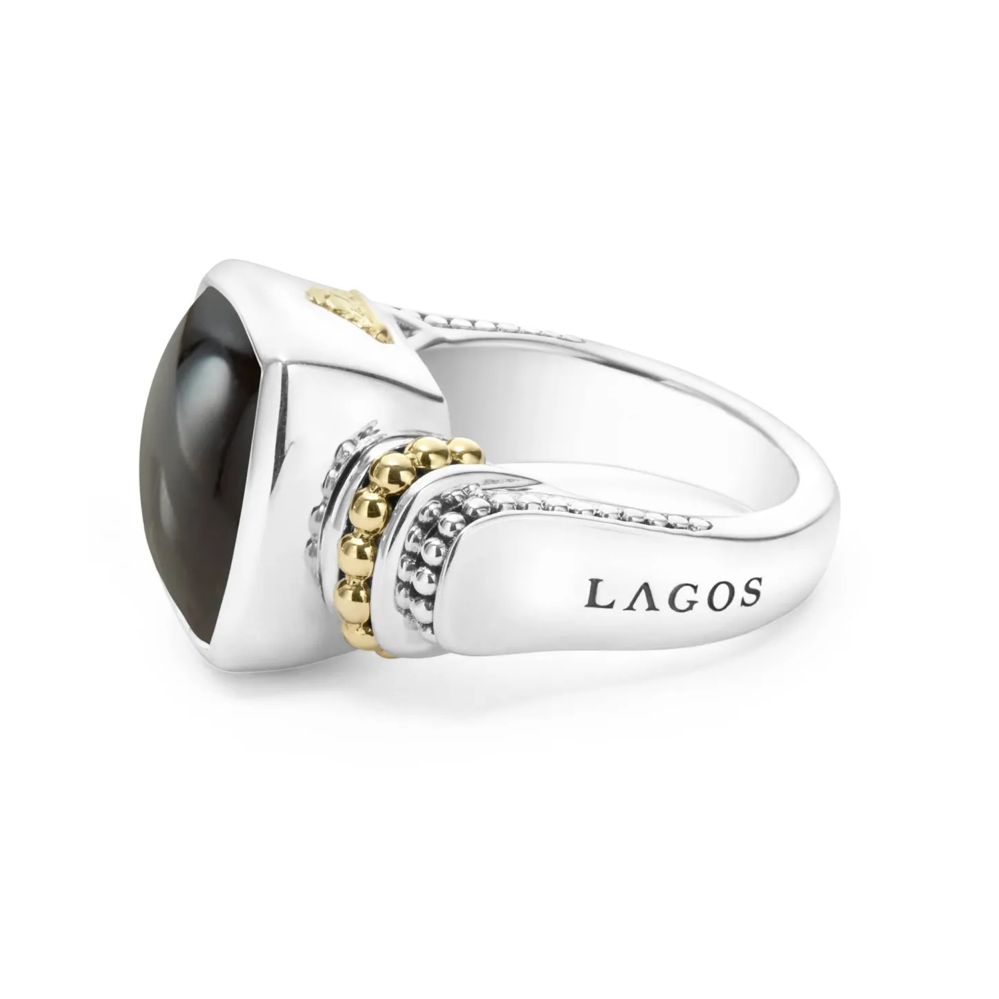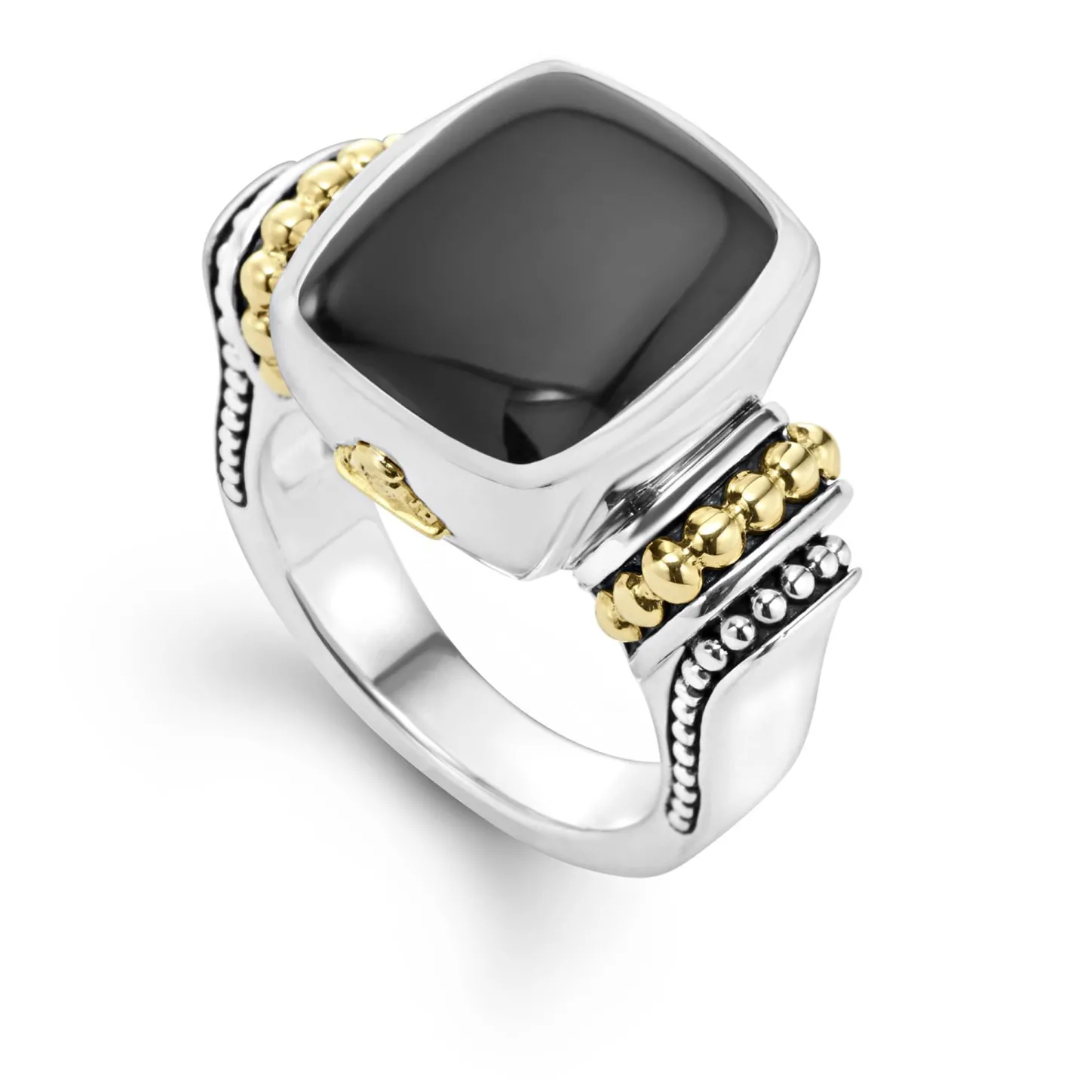 Onyx Bezel-Set Gemstone Ring With 18K Gold Caviar Beading On A Sterling Silver Band.