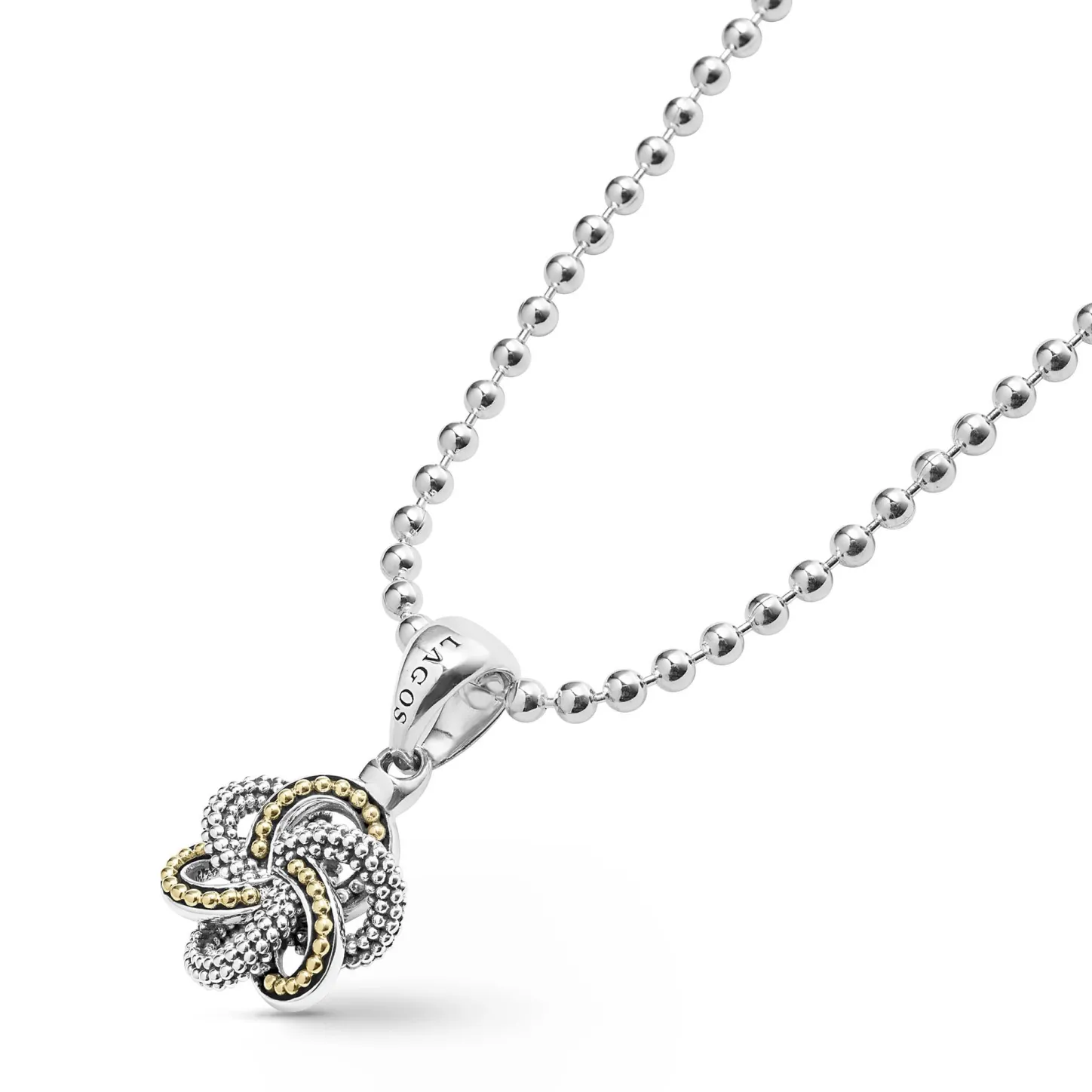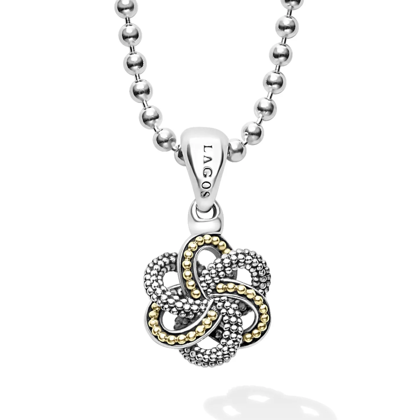18K Gold And Sterling Silver Caviar Beaded Love Knot Pendant Finished On A Ball Chain Necklace.