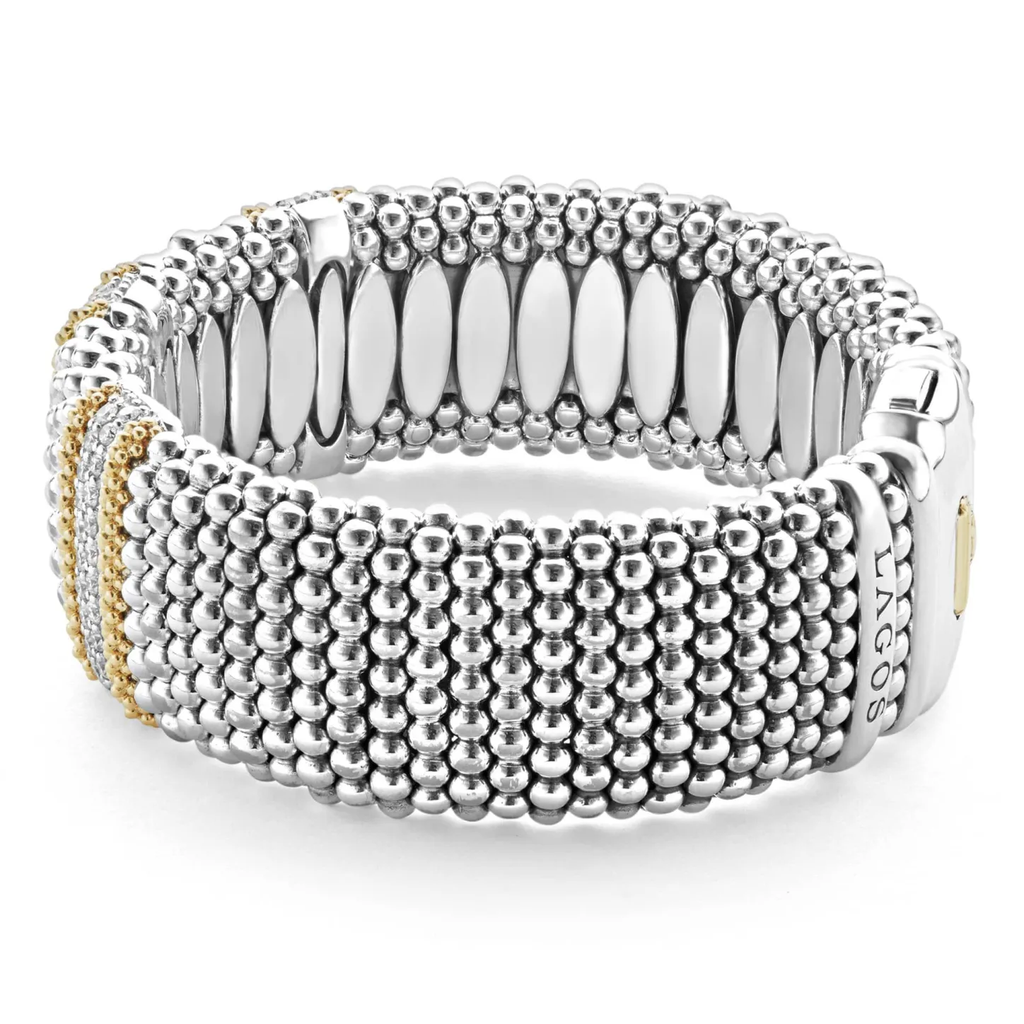 Three Diamond Stations Highlighted By 18K Gold Surrounded By Sterling Silver Caviar Beading. Lagos Diamonds Are The Highest Quality Natural Stones.