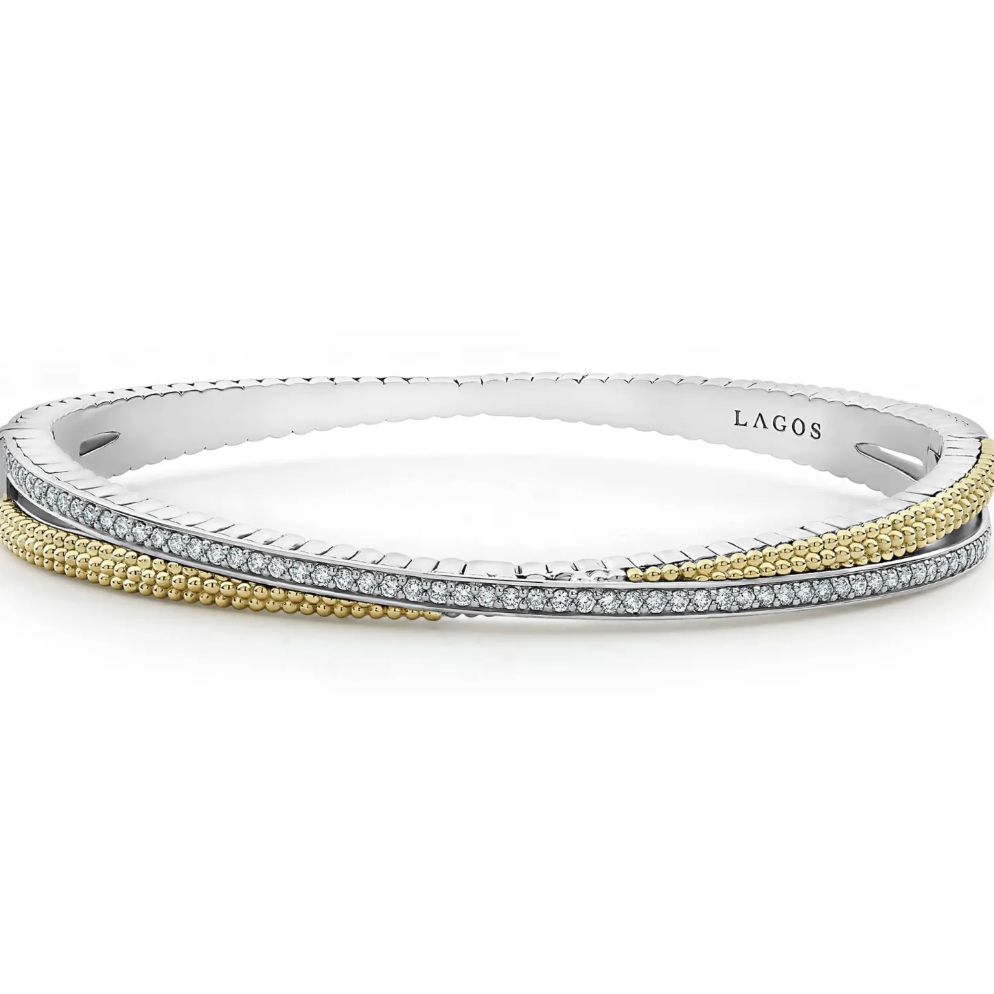Diamonds Set In Sterling Silver Are Highlighted By 18K Gold Caviar Beading On This Signature X-Bangle Bracelet. Lagos Diamonds Are The Highest Quality Natural Stones.