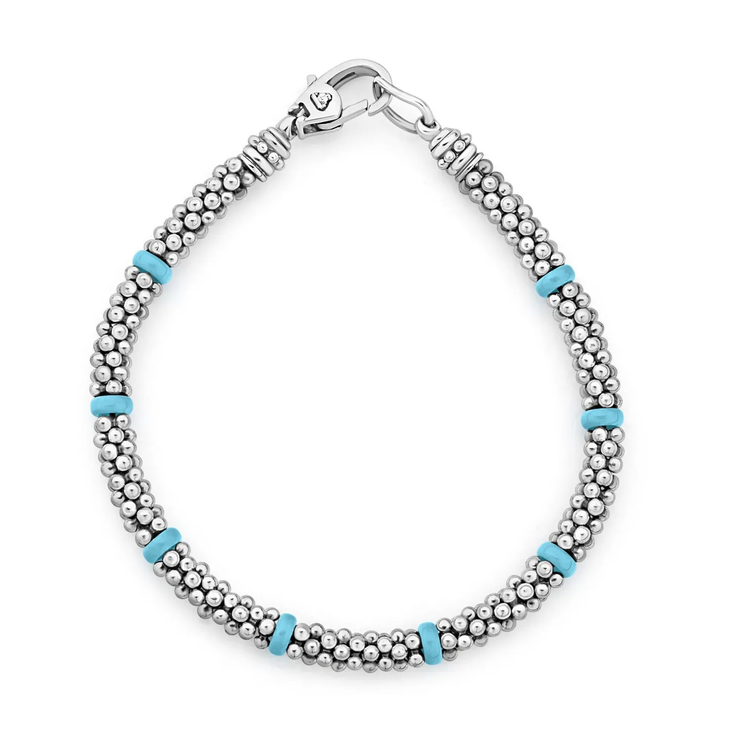 A Lagos Exclusive. Three Classic Bracelets To Layer And Make Your Own. One Best-Selling Sterling Silver Caviar Bracelet Detailing An Open Circle. One Blue Ceramic Caviar Bracelet. One Sterling Silver Bracelet With Smooth Blue Ceramic Stations.