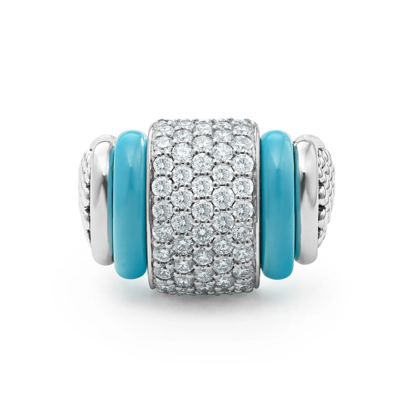 Diamonds Set In Sterling Silver Are Accented By Sleek Blue Ceramic And Caviar Beading On This Ring. Lagos Diamonds Are The Highest Quality Natural Stones.