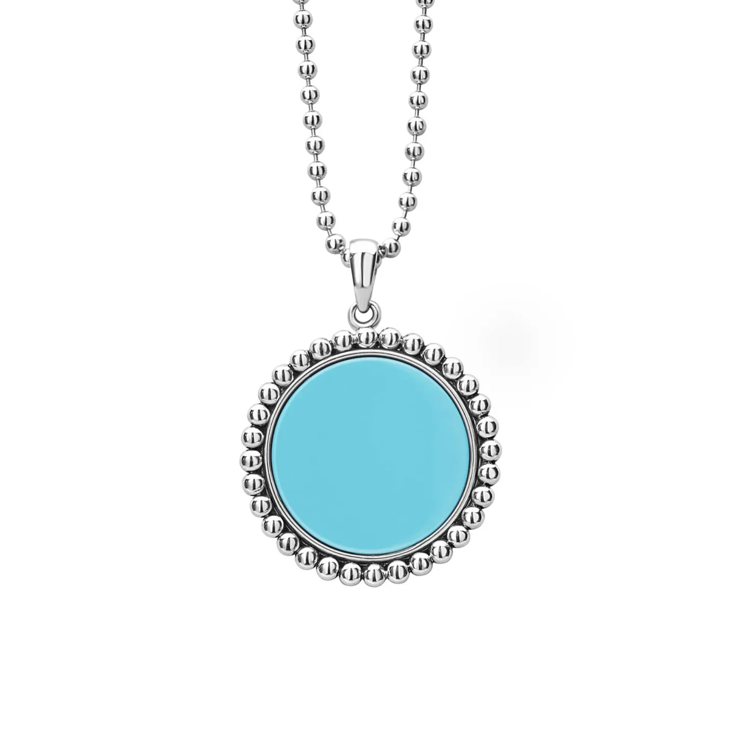 A Blue Ceramic Pendant Framed By Sterling Silver Caviar Beading Finsihed On A Versatile Ball Chain Necklace.