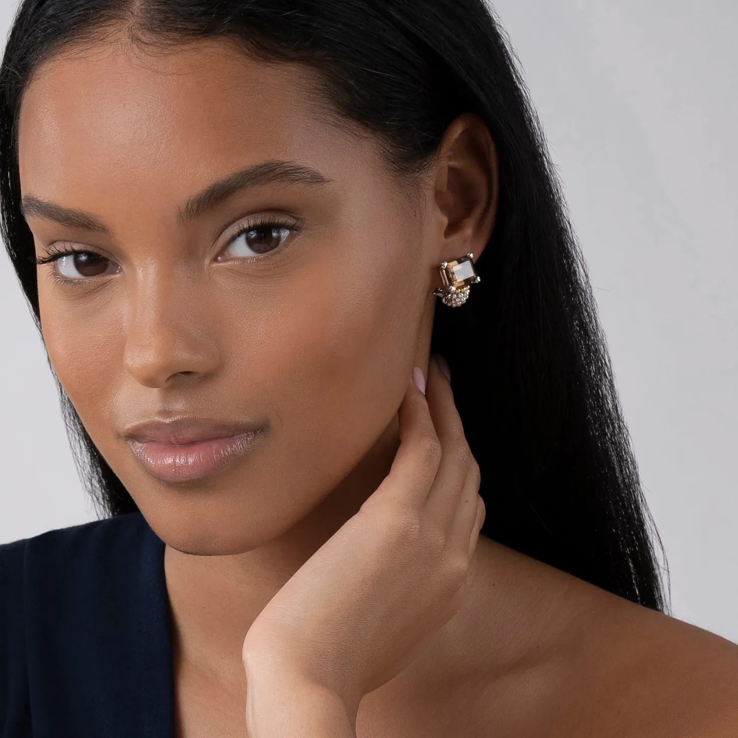 Smokey Quartz Emerald-Cut Gemstone Earring With A Prong Setting In Sterling Silver And 18K Gold Caviar Beading.