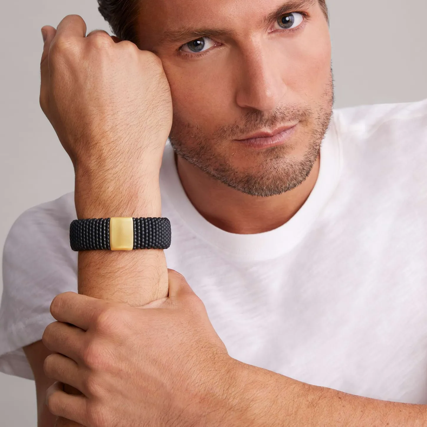 A Matte Black Ceramic Caviar Beaded Bracelet Accented By A Satin Finish 18K Gold Station Finished With A Double-Button Box Clasp.