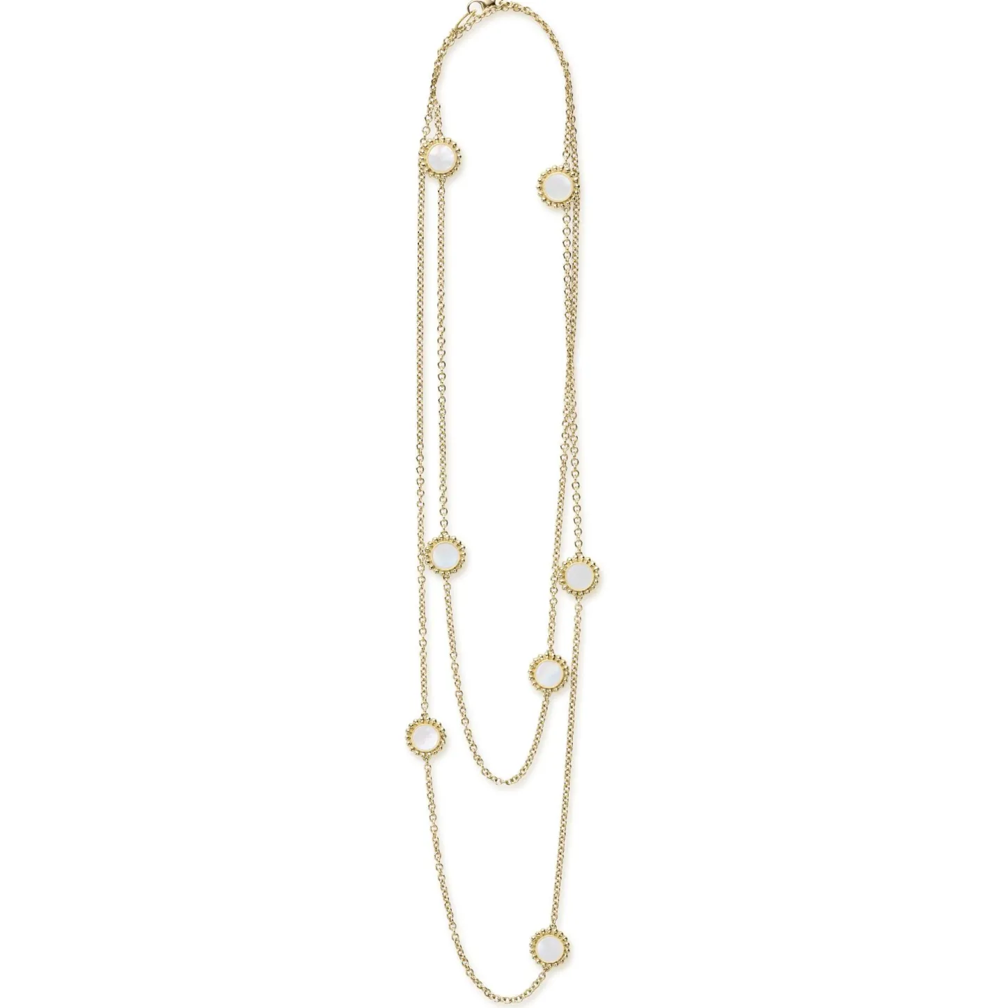 Seven Round Mother Of Pearl Stations Set And Surrounded By 18K Gold Caviar Beading On This Necklace.
