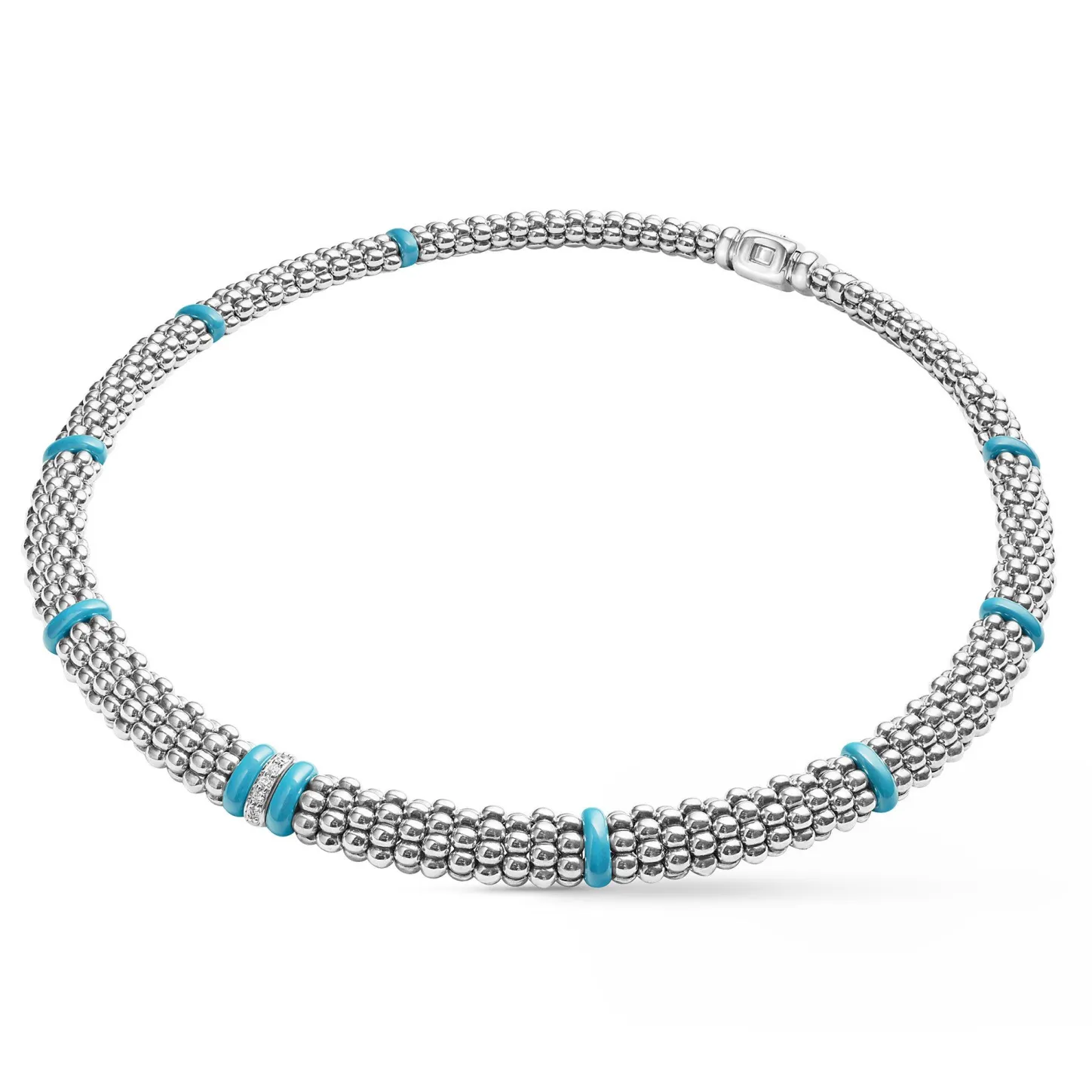 One Diamond Station Set In Sterling Silver Surrounded By Ten Blue Ceramic Stations With Sterling Silver Caviar Beading. Lagos Diamonds Are The Highest Quality Natural Stones.