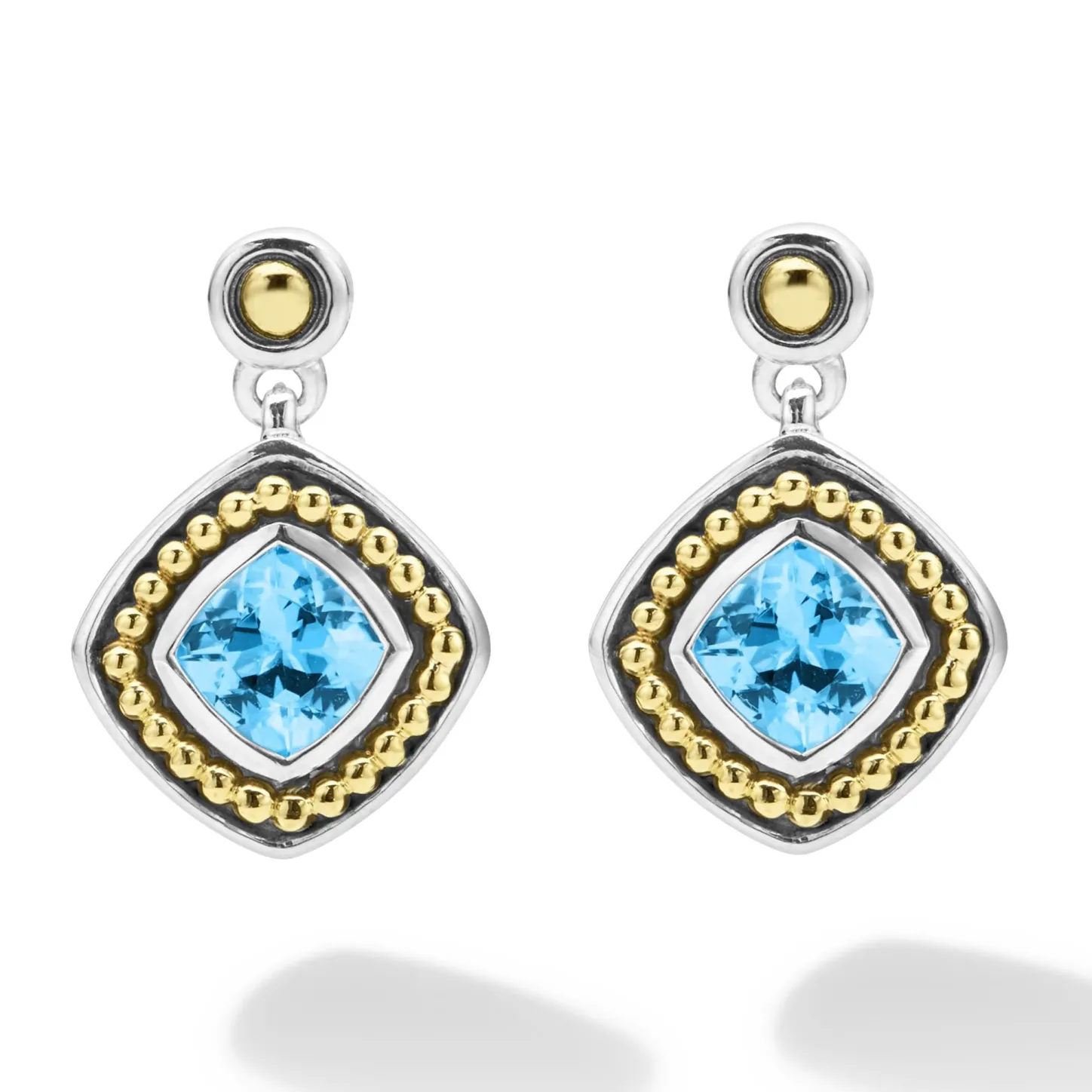 Swiss Blue Topaz Gemstone Drop Earrings Surrounded By Sterling Silver And 18K Gold Caviar Beading.