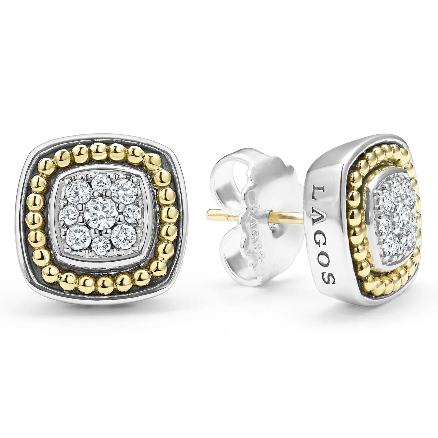 A Lagos Exclusive. Diamonds Surrounded By Sterling Silver And 18K Gold Caviar Beading Form These Stud Earrings. Lagos Diamonds Are The Highest Quality Natural Stones.