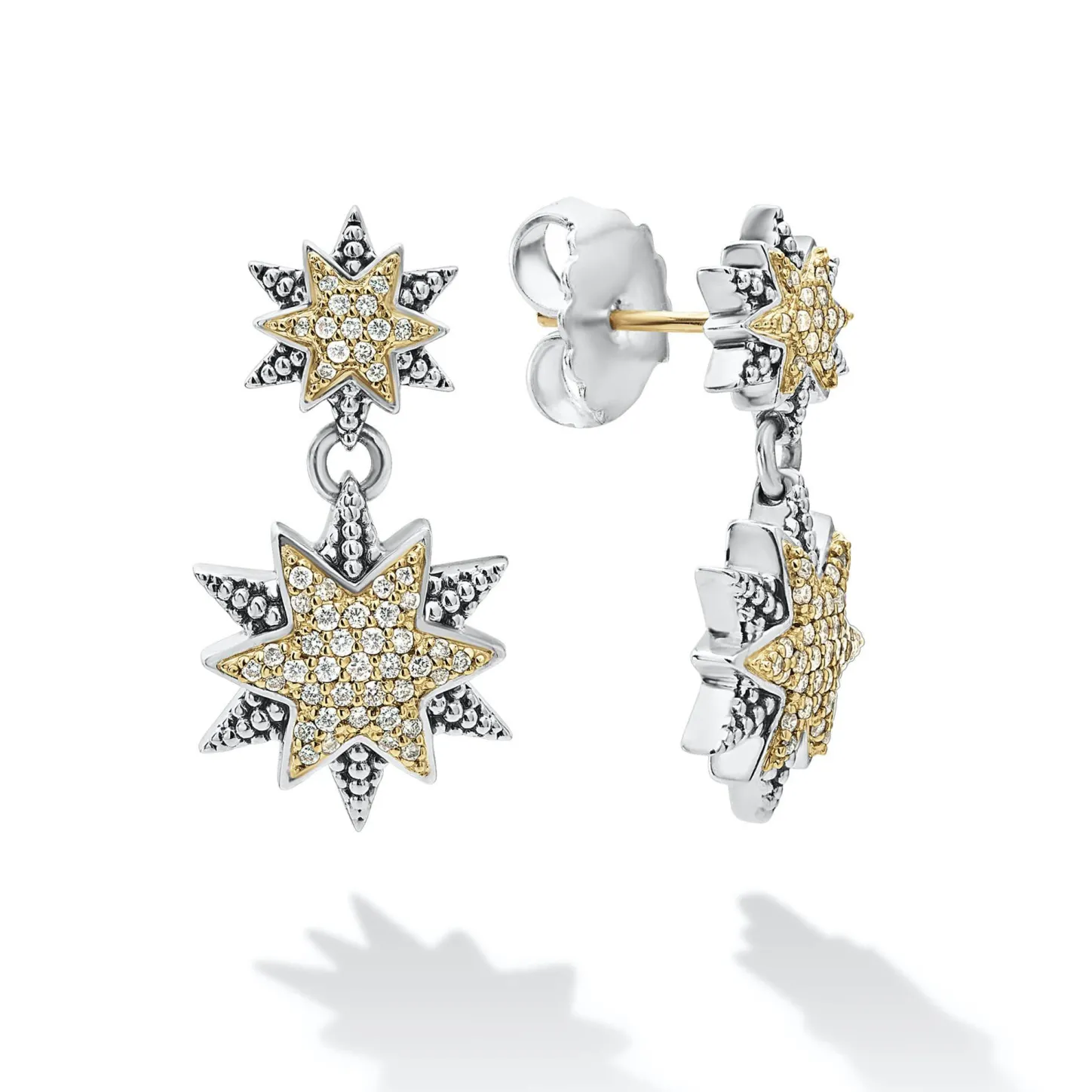 Diamonds, 18K Gold, And Sterling Silver Caviar Beading Form These Double Star Motif Drop Earrings. Lagos Diamonds Are The Highest Quality Natural Stones.