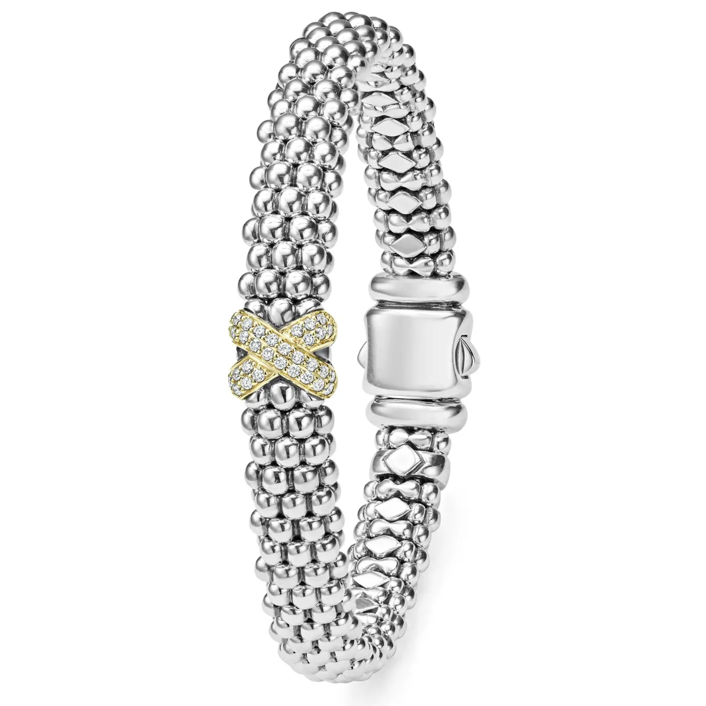 A Single Diamond X Station Set In 18K Gold Wraps This Signature Sterling Silver Caviar Beaded Bracelet. Lagos Diamonds Are The Highest Quality Natural Stones.