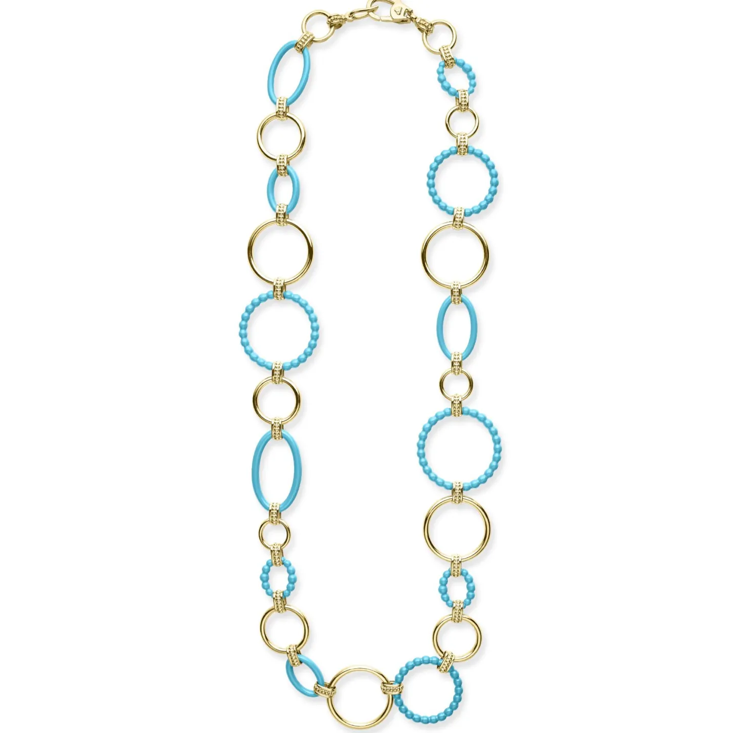 A Modern Necklace With 18K Gold And Blue Ceramic Round, Oval And Beaded Links.