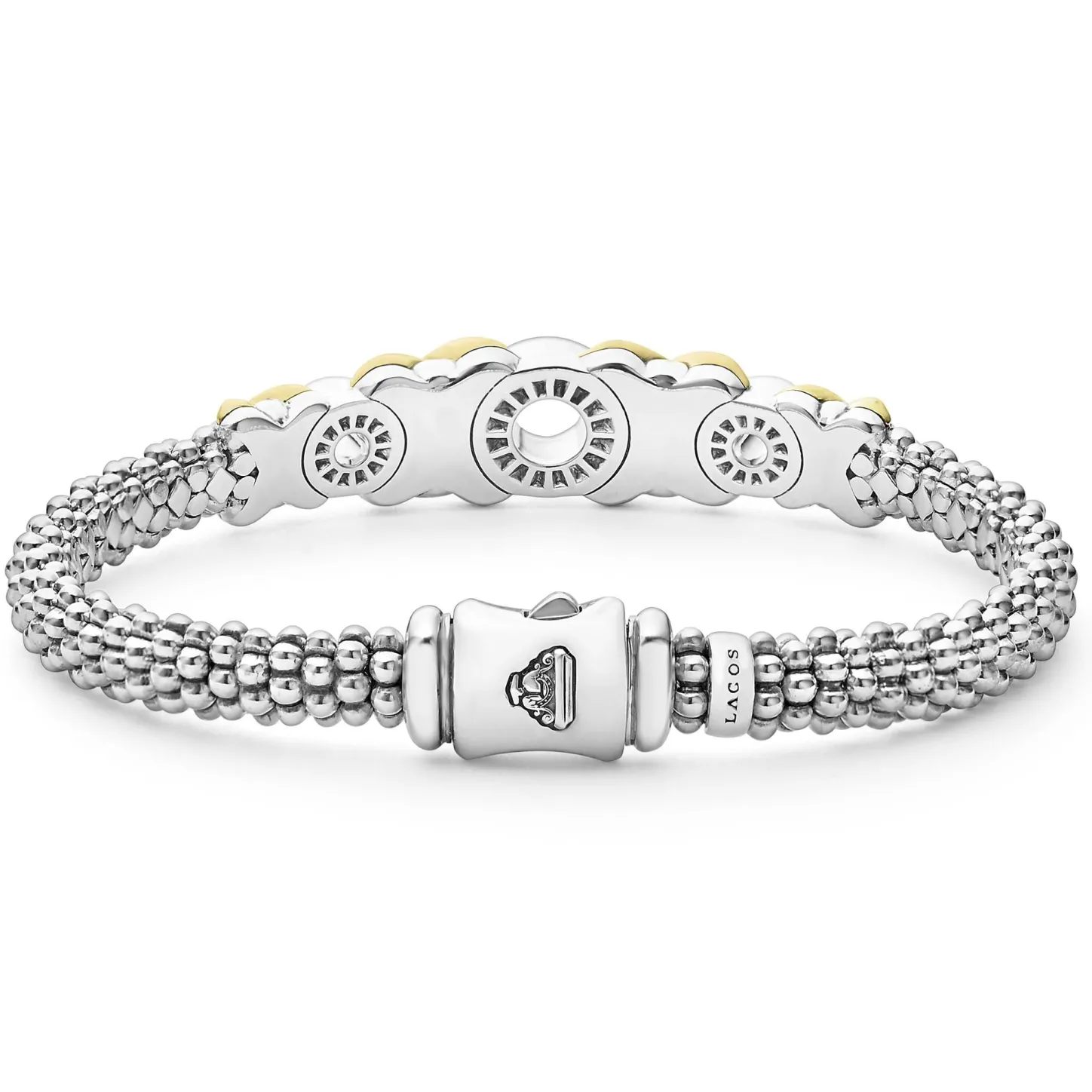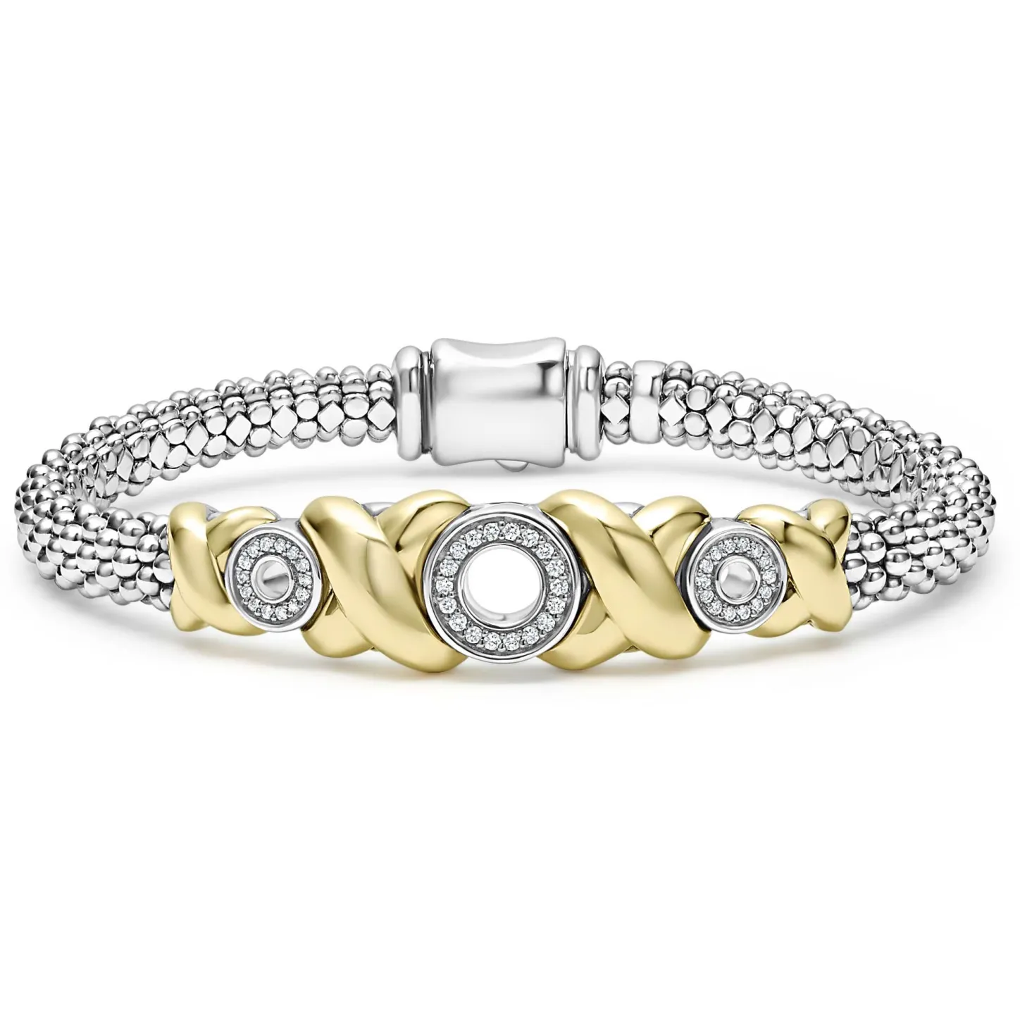 Three Diamond Circles Set In 18K Gold X-Motifs Accent This Sterling Silver Caviar Beaded Bracelet. Lagos Diamonds Are The Highest Quality Natural Stones.