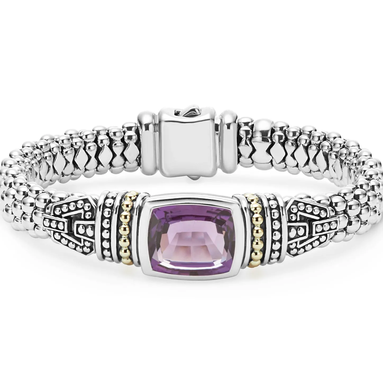 Amethyst Bezel-Set Gemstone And Sterling Silver Caviar Beading With 18K Gold Detailing Forms This Bracelet.