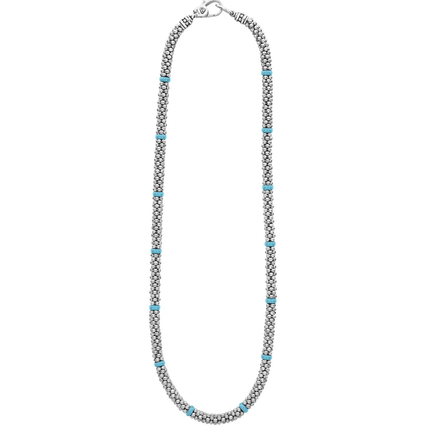 A Sterling Silver Caviar Beaded Necklace With 14 Blue Ceramic Stations.