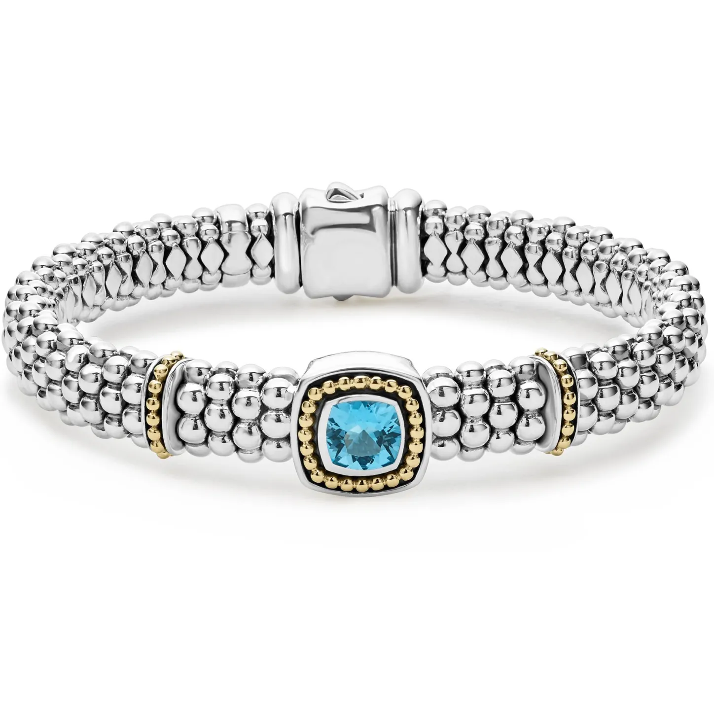 A Swiss Blue Topaz Gemstone And Sterling Silver Caviar Beading With 18K Gold Detailing Forms This Bracelet.