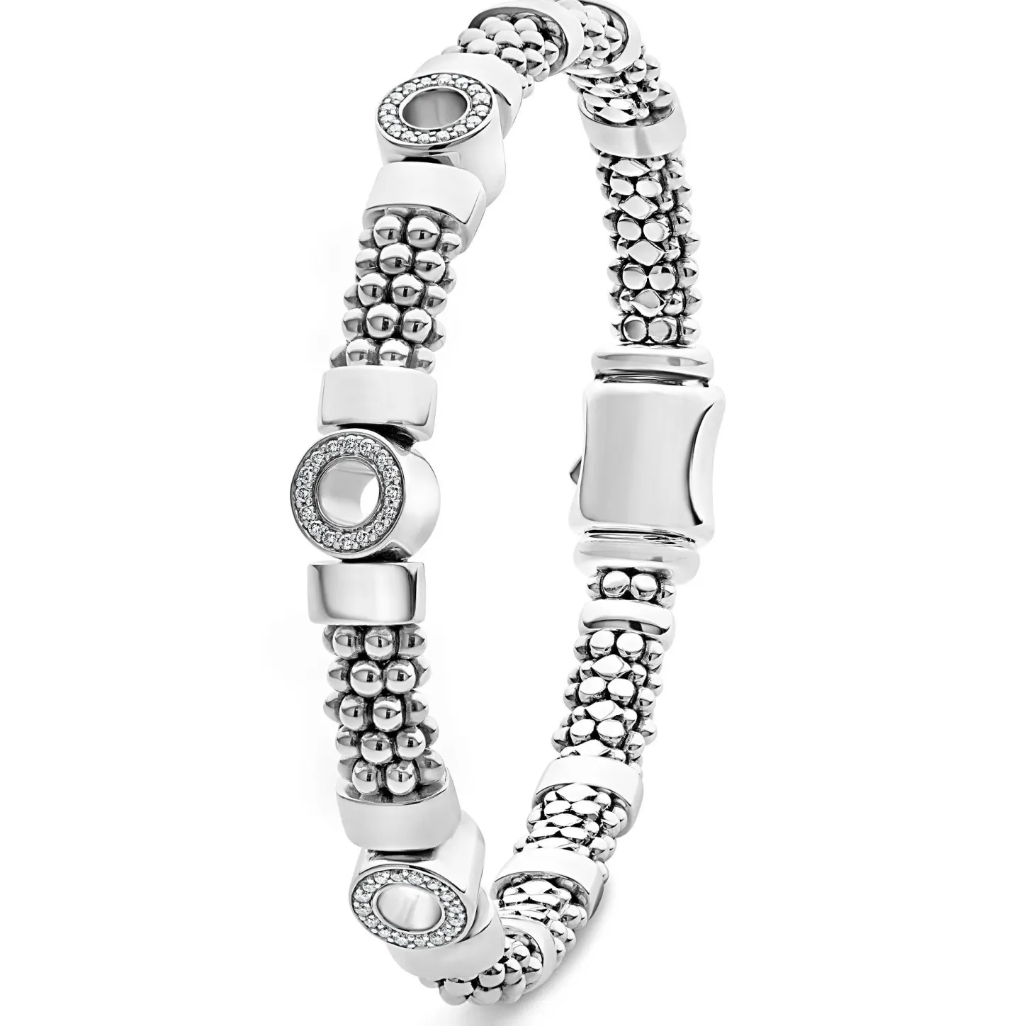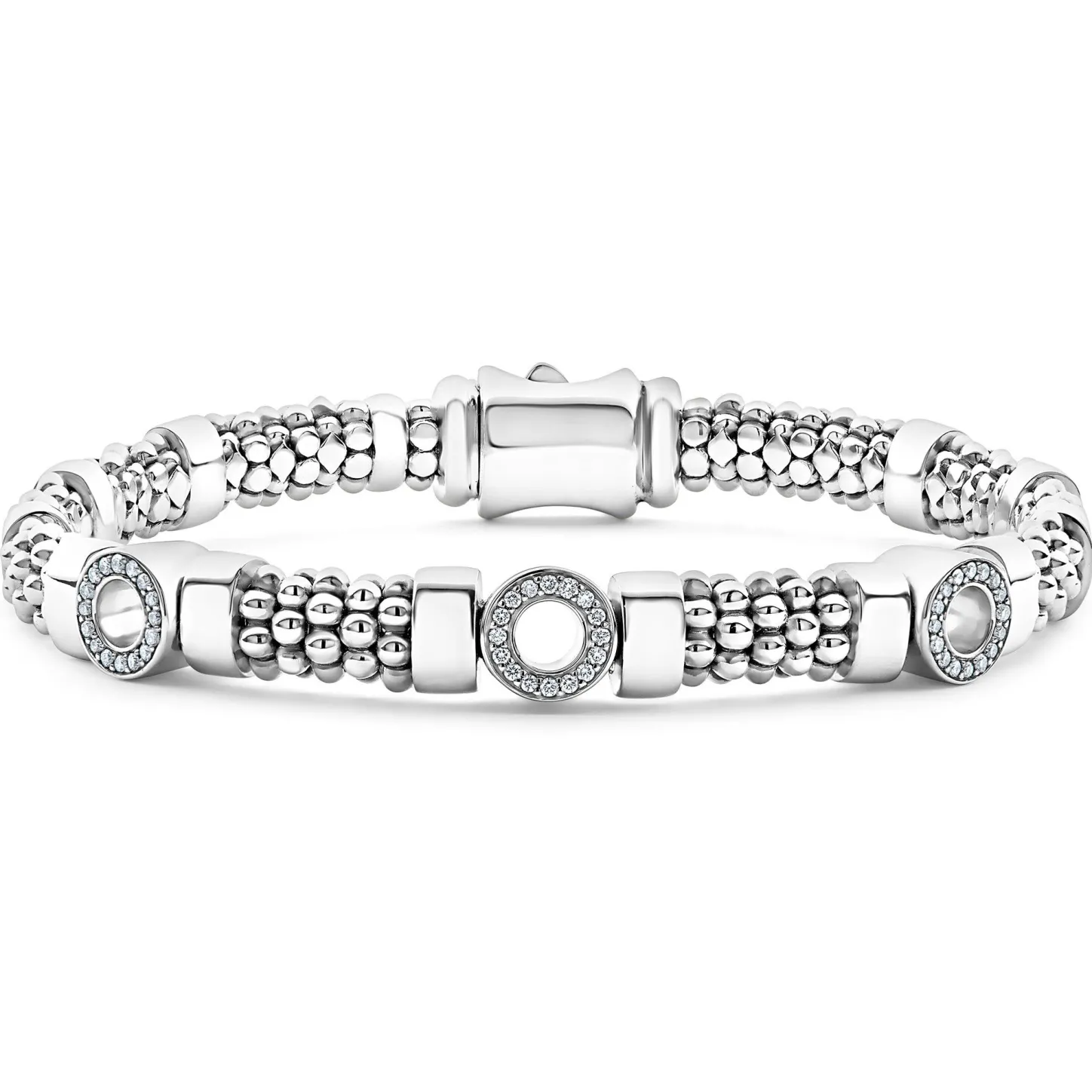 A Sterling Silver Bracelet With Three Diamond Circle Stations. Lagos Diamonds Are The Highest Quality Natural Stones.