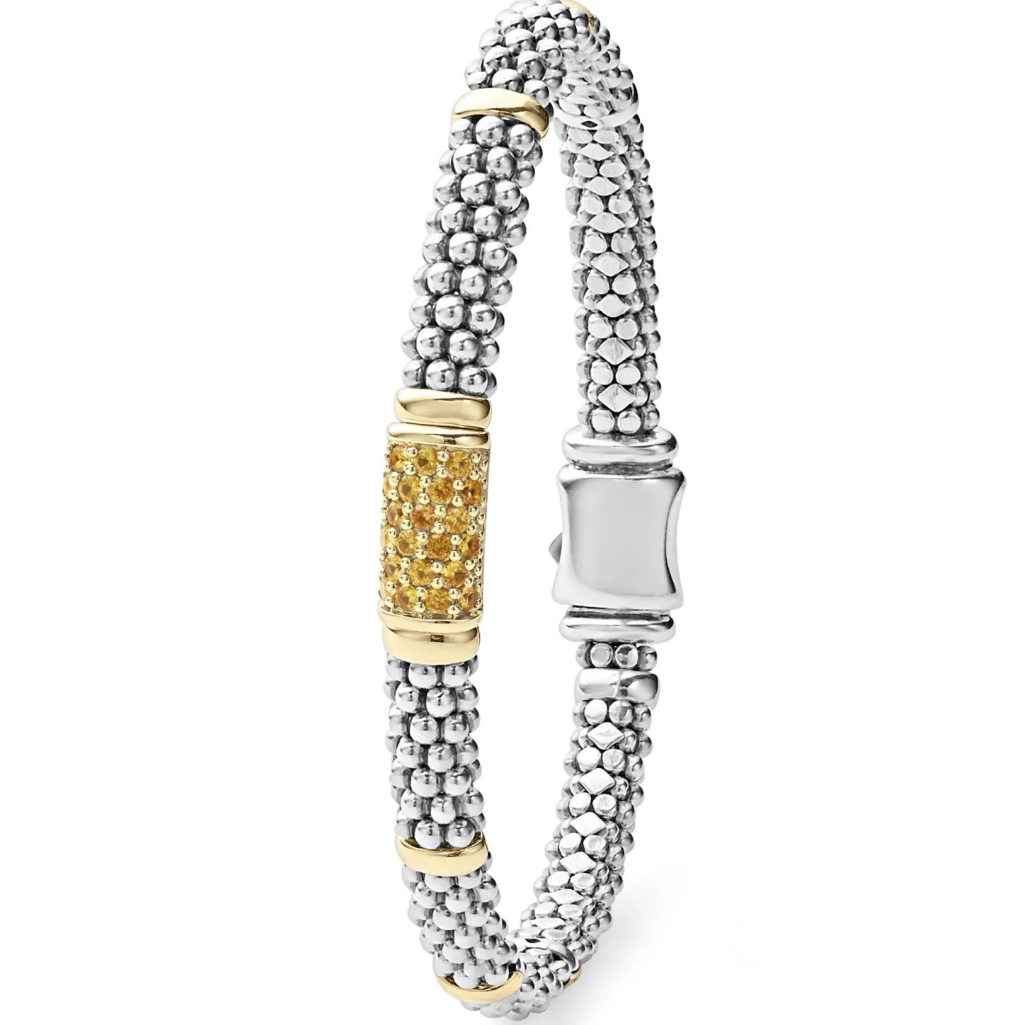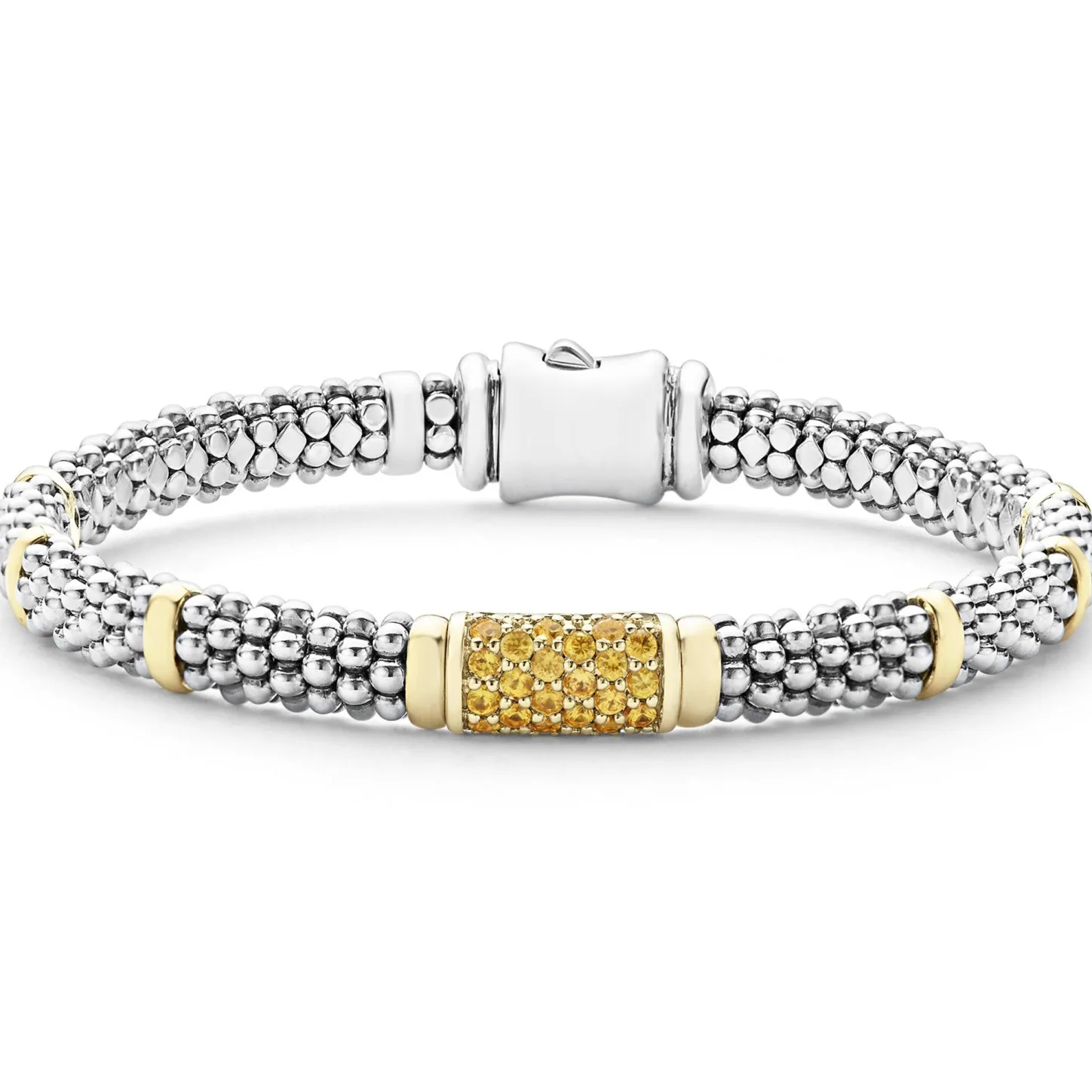 Ten 18K Gold Stations Highlight This Sterling Silver Caviar Beaded Bracelet With A Pavé Station Of Yellow Sapphire Precious Gemstones.