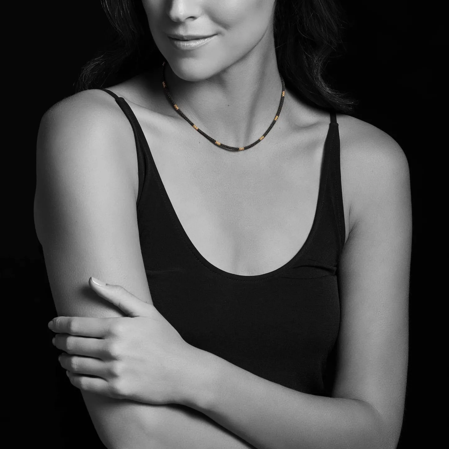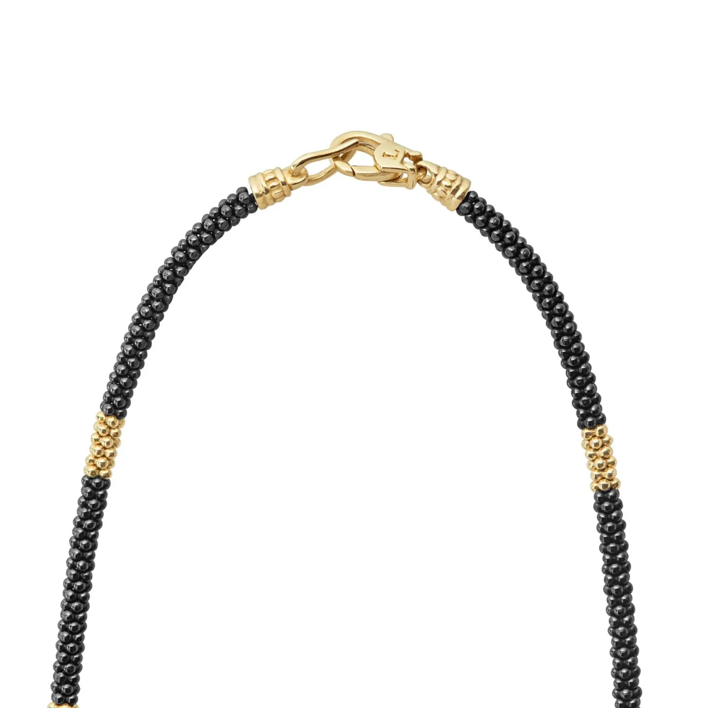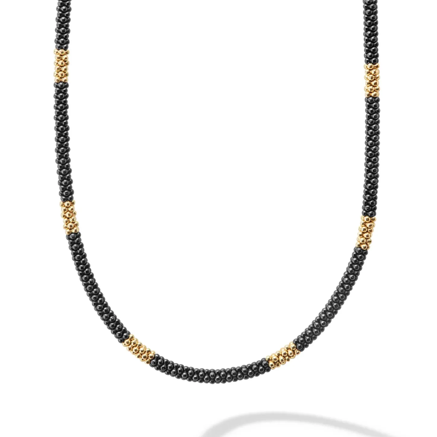 Twelve 18K Gold Stations Highlighted By Black Ceramic Caviar Beading On This Necklace Finished With An 18K Gold Lobster Clasp.