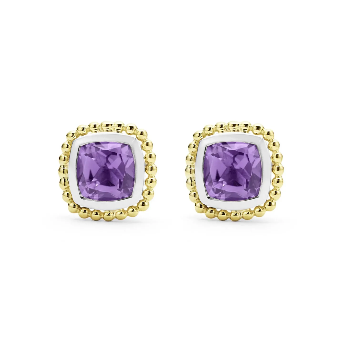 - One Set Of Amethyst Gemstone Stud Earrings Surrounded By Smooth Sterling Silver And 18K Gold Caviar Beading.