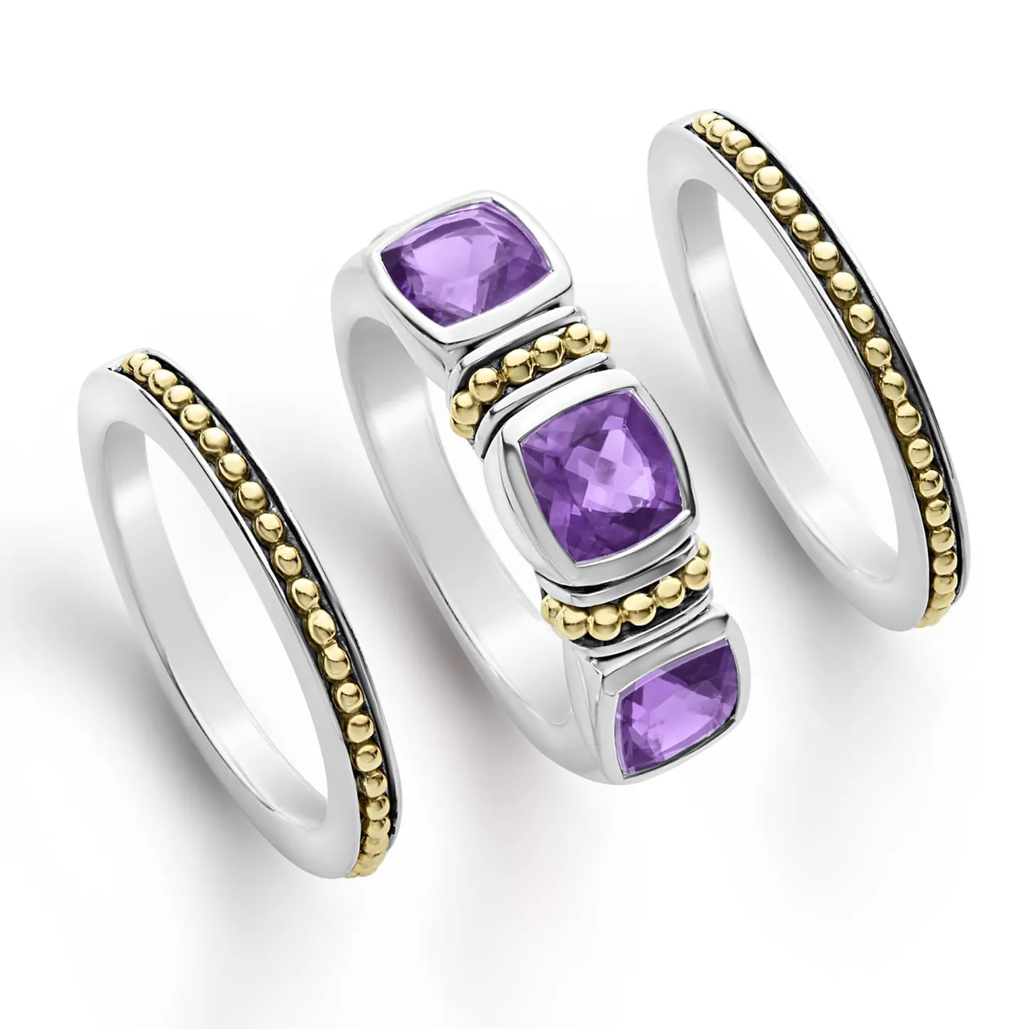 A Lagos Exclusive. A Trio Of Stacking Rings With One Amethyst Ring And Two 18K Gold Caviar Beaded Rings With Sterling Silver Accents.