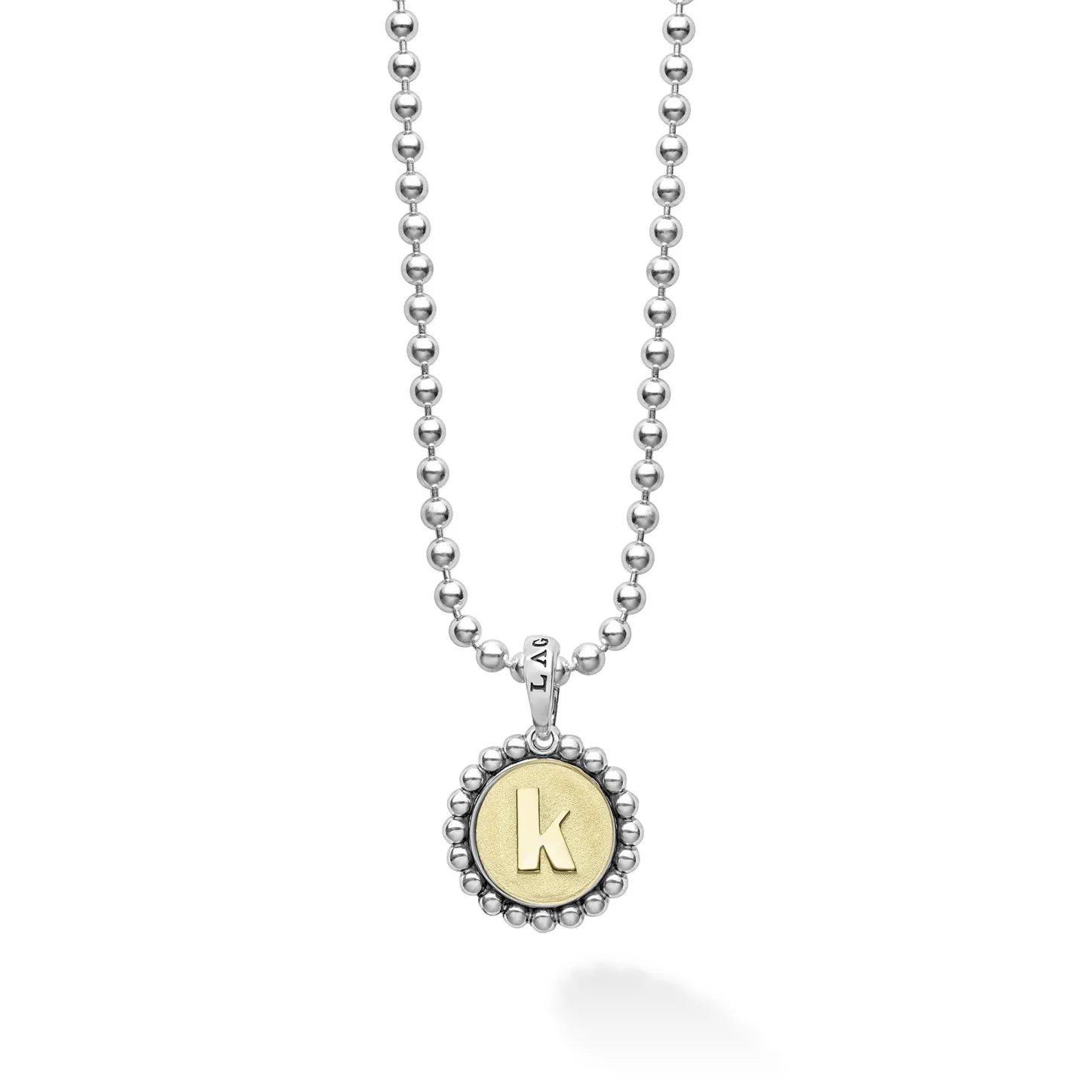 Our Signature Caviar Sterling Silver And 18K Gold Initial ‘K’ Charm Finished On A Sterling Silver Ball Chain Necklace.