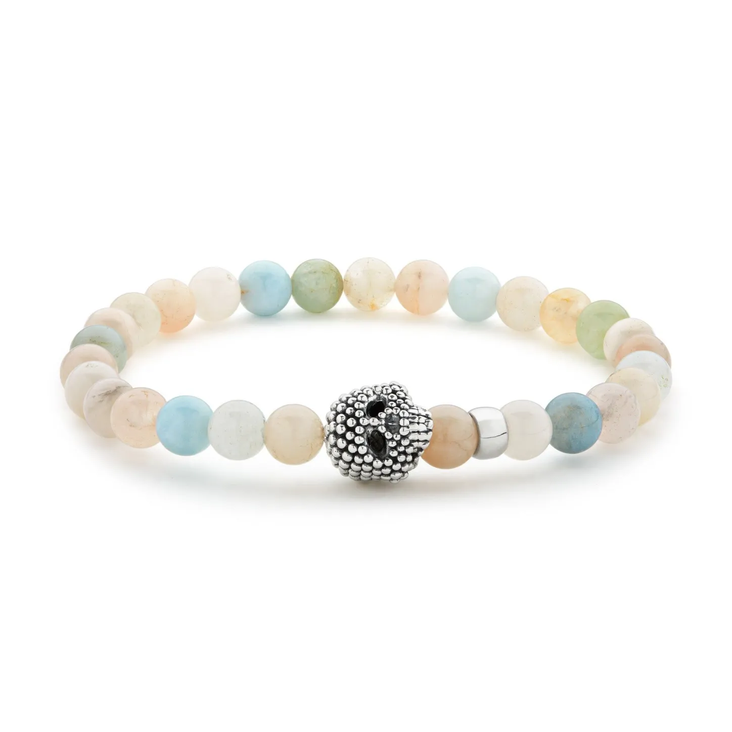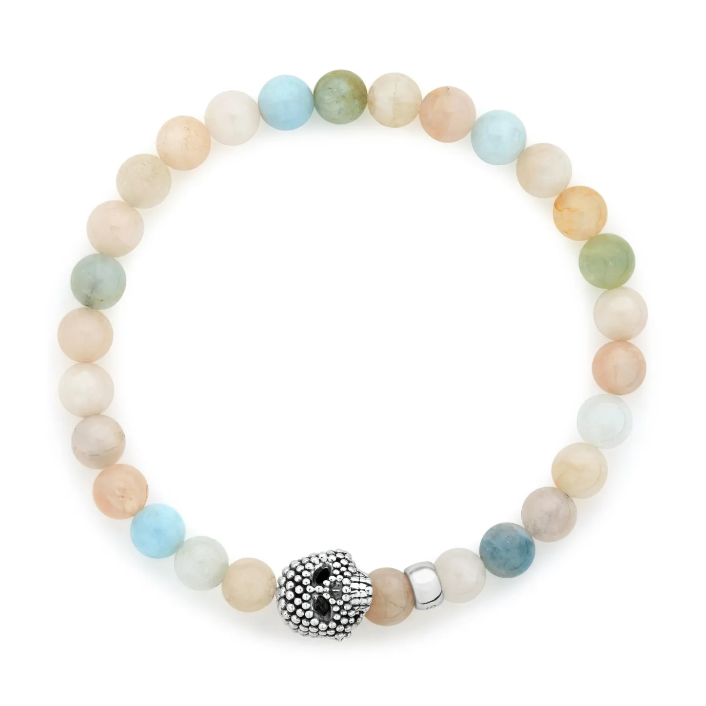 Morganite Gemstone Beaded Bracelet With A Sterling Silver Caviar Skull.