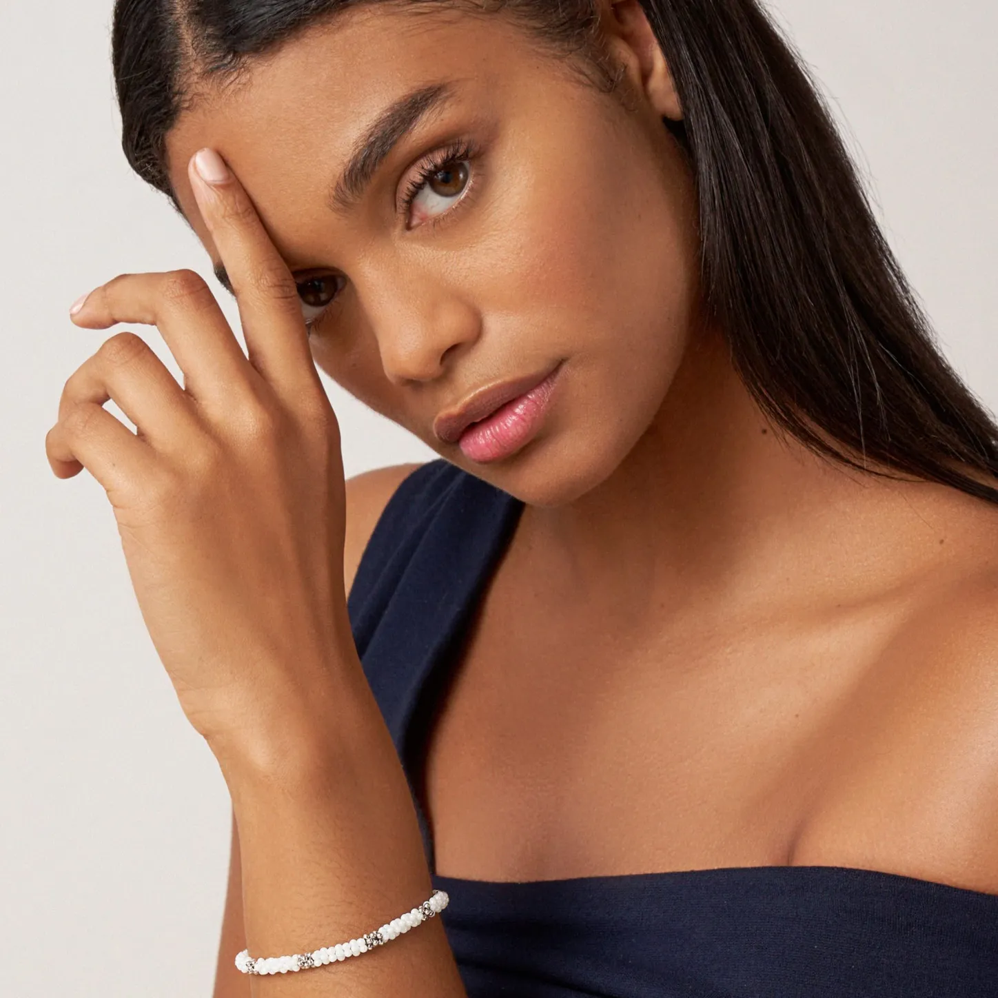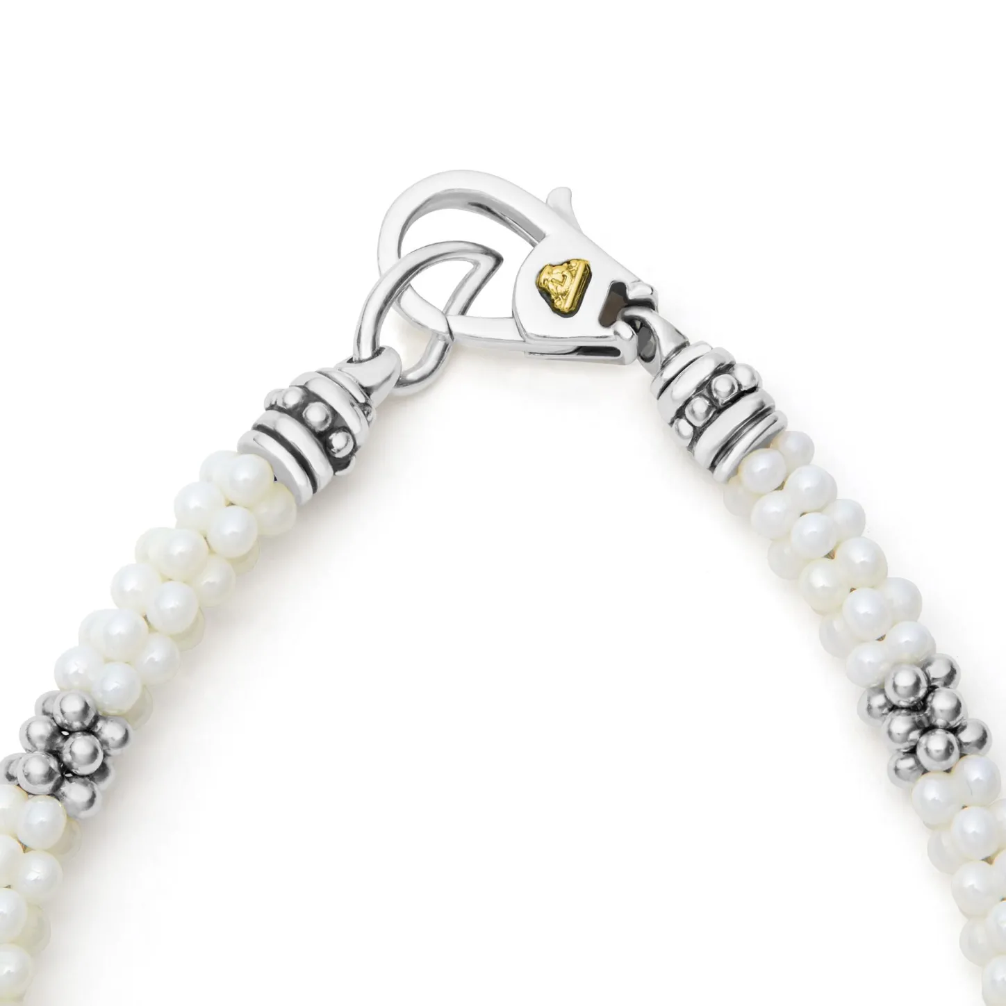 A White Ceramic Caviar Bracelet Accented By Seven Sterling Silver Stations.