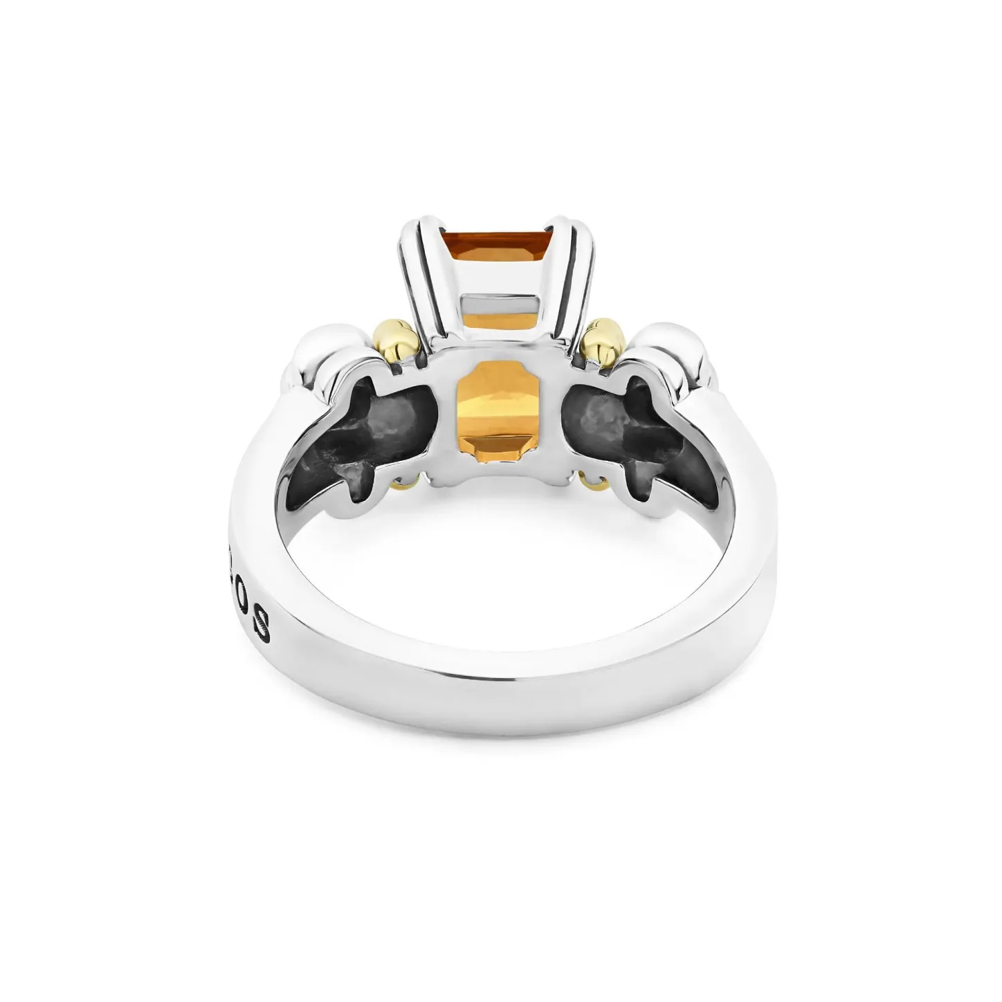 The Return Of A Lagos Icon. Our Signature Emerald-Cut Citrine Gemstone Ring With A Prong Setting In Sterling Silver And 18K Gold Caviar Beading.