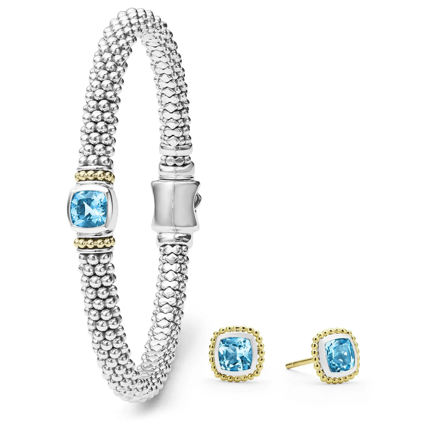- One Swiss Blue Topaz Gemstone And Sterling Silver Caviar Beaded Bracelet Accented With 18K Gold Detailing. Set Includes Size Medium.