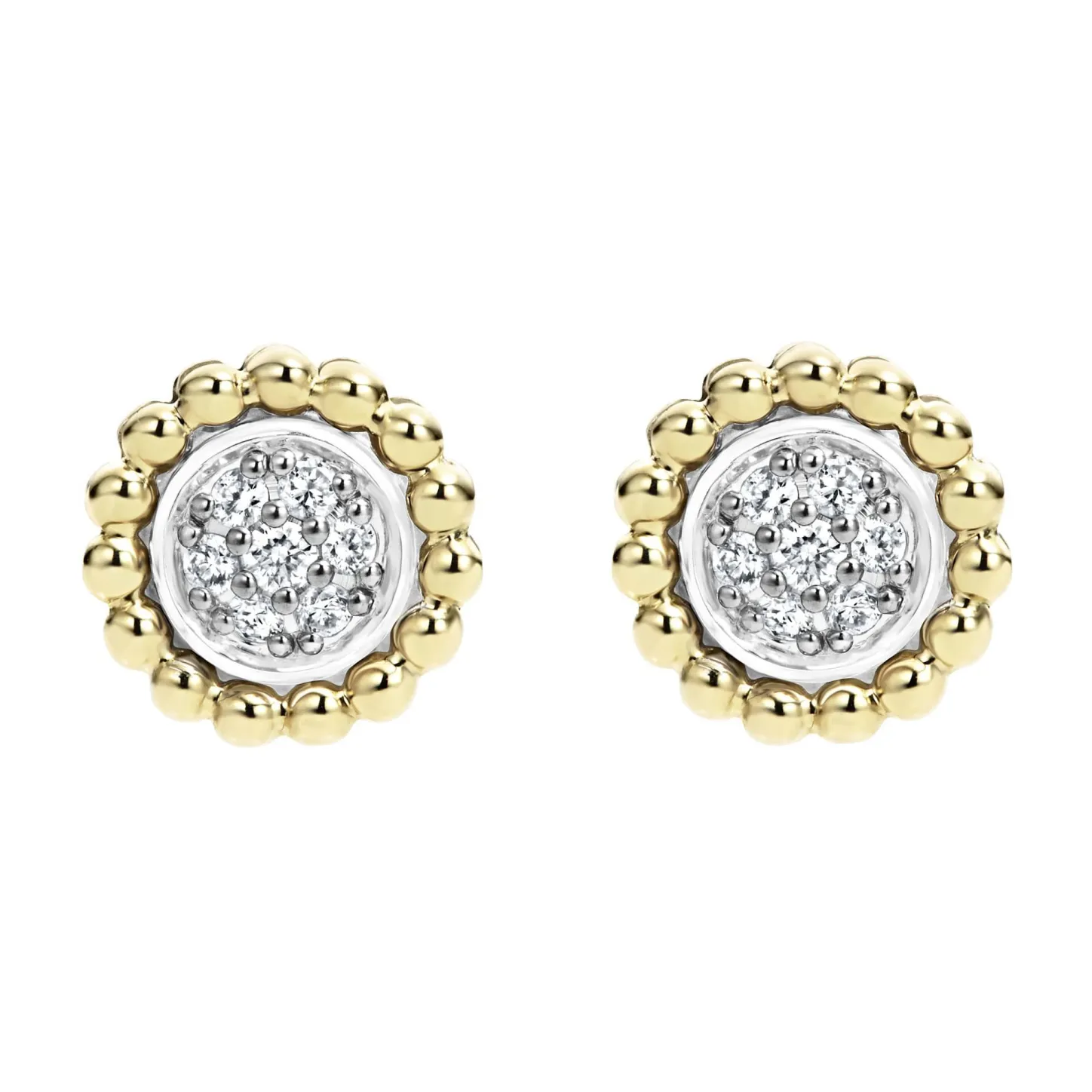 Pavé Diamond Circle Stud Earrings Framed By 18K Gold Caviar Beading. Lagos Diamonds Are The Highest Quality Natural Stones.