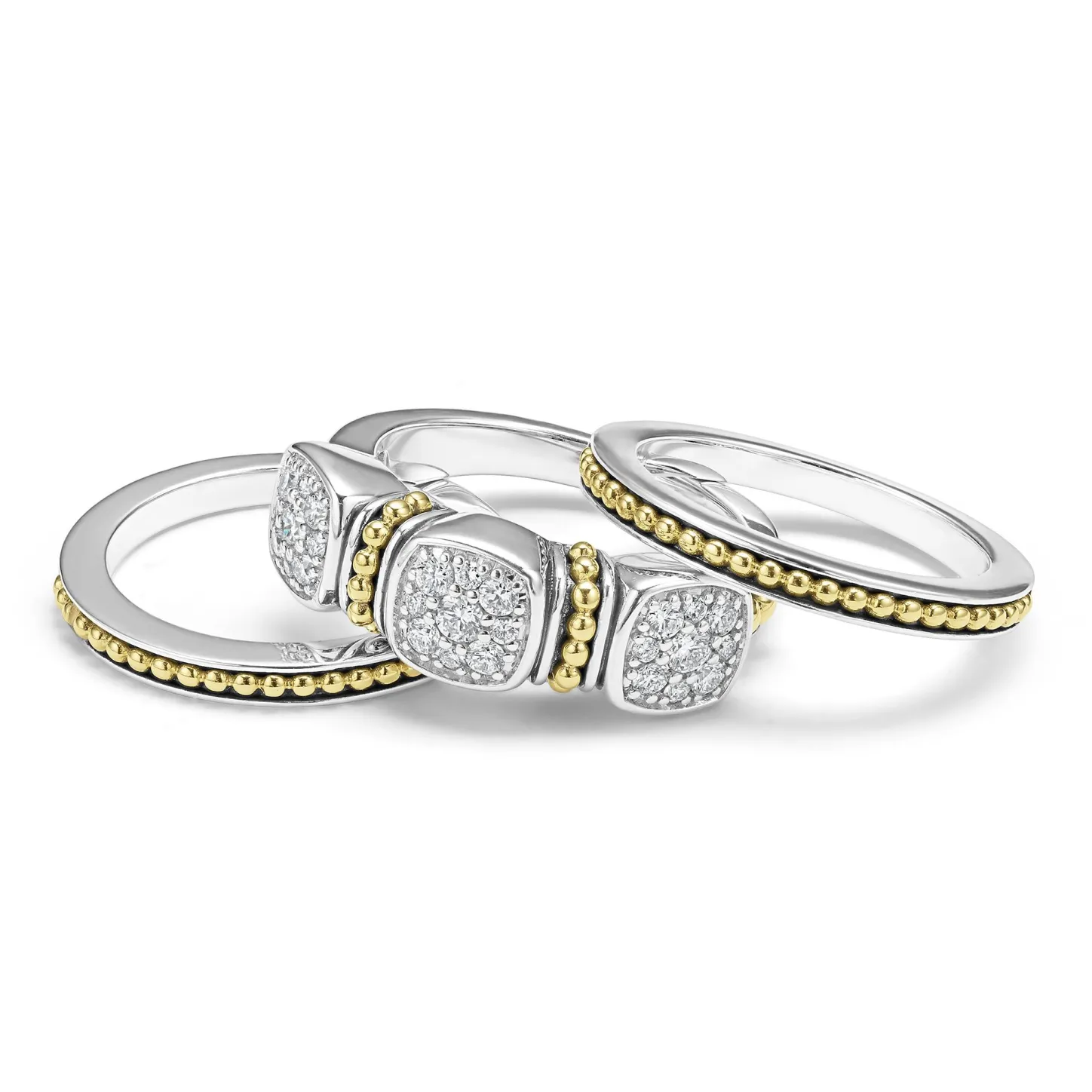 A Lagos Exclusive. A Trio Of Stacking Rings With One Diamond Ring And Two 18K Gold Caviar Beaded Rings With Sterling Silver Accents.