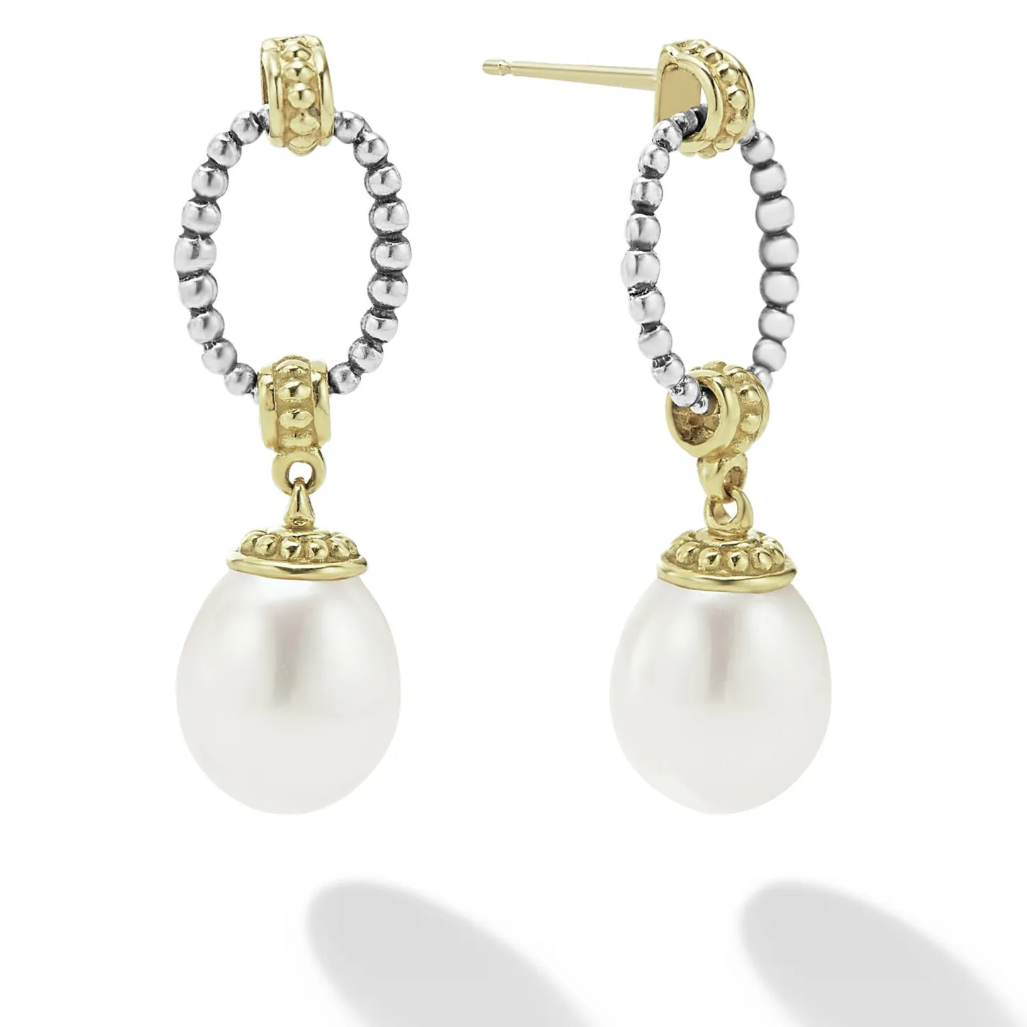 Sterling Silver And 18K Gold Caviar Beaded Post Earrings With Pearl Drop Detailing.