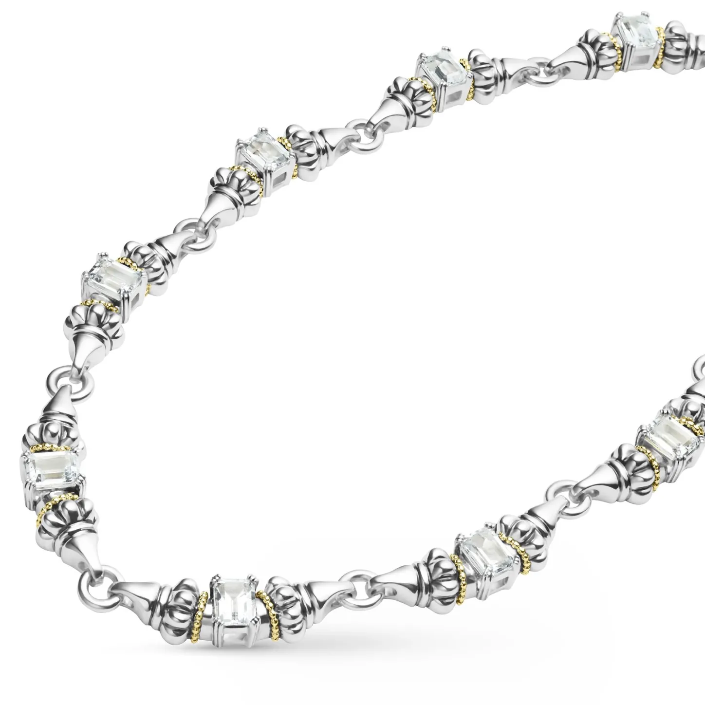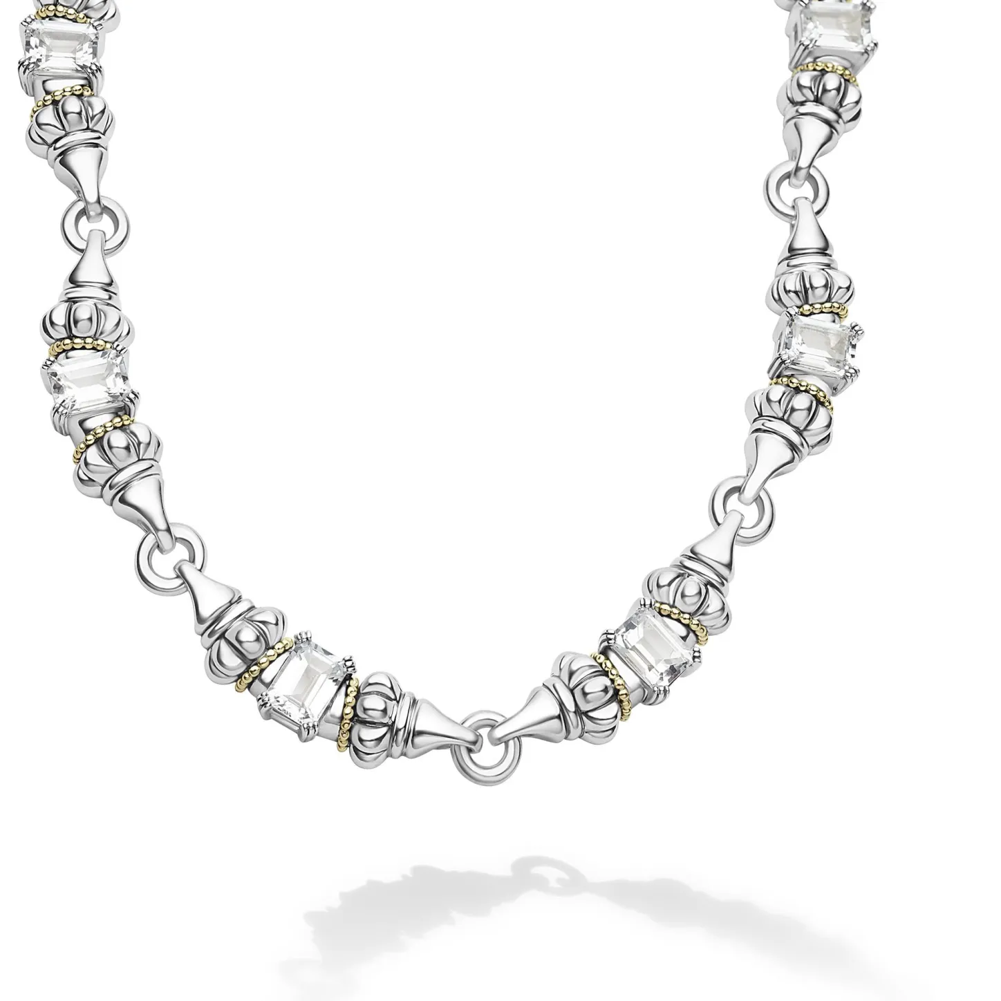 Ten Emerald-Cut White Topaz Gemstones With A Prong Setting In Sterling Silver And 18K Gold Caviar Beading Form This Necklace.