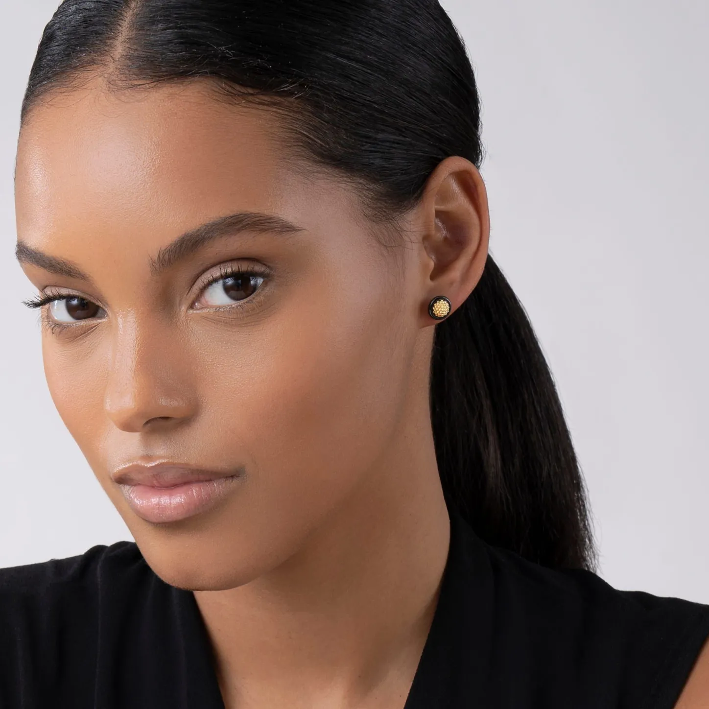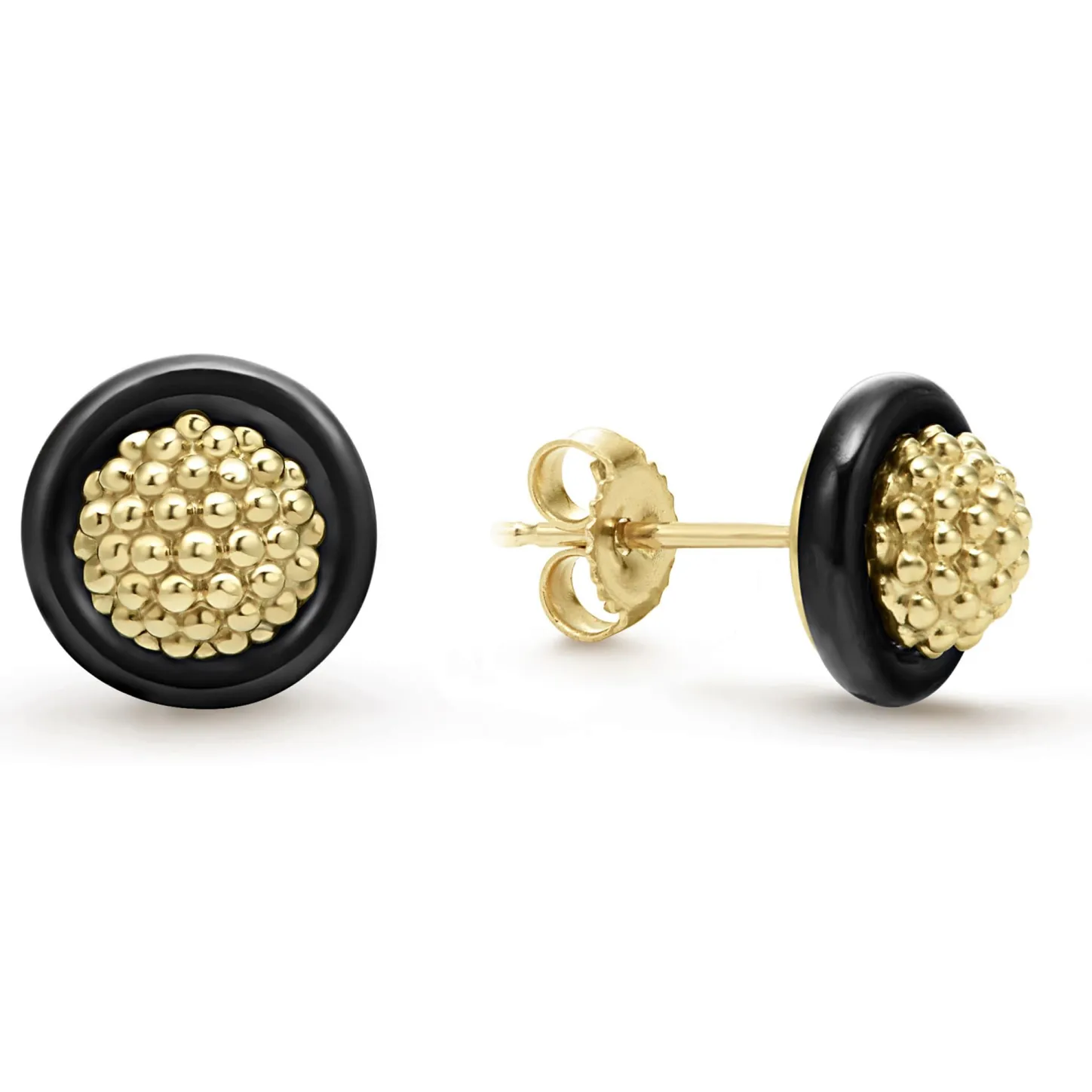 18K Gold Caviar Beading Surround By Black Ceramic Detailing Form These Studs.
