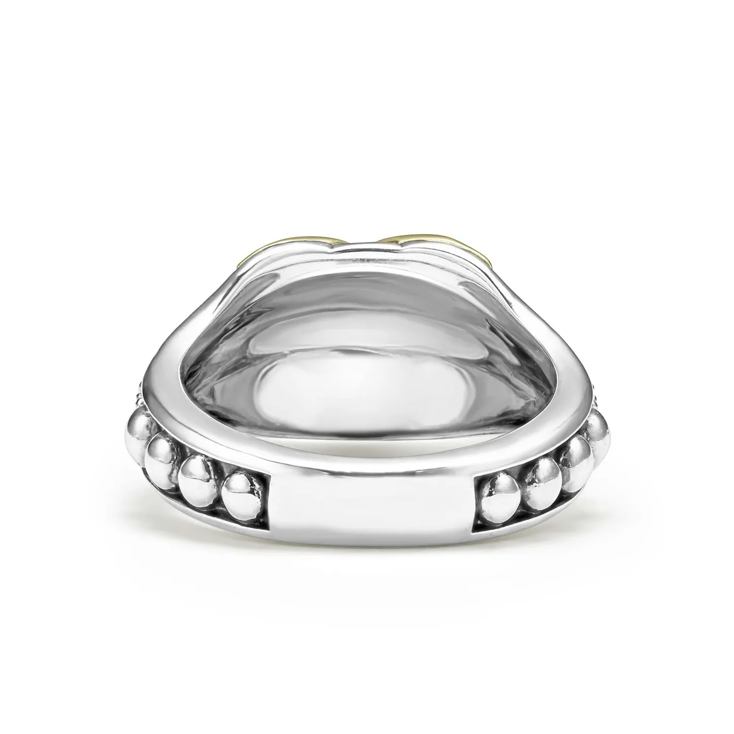 An 18K Gold X-Motif Surrounded By Diamonds Forms This Statement Ring. Lagos Diamonds Are The Highest Quality Natural Stones.
