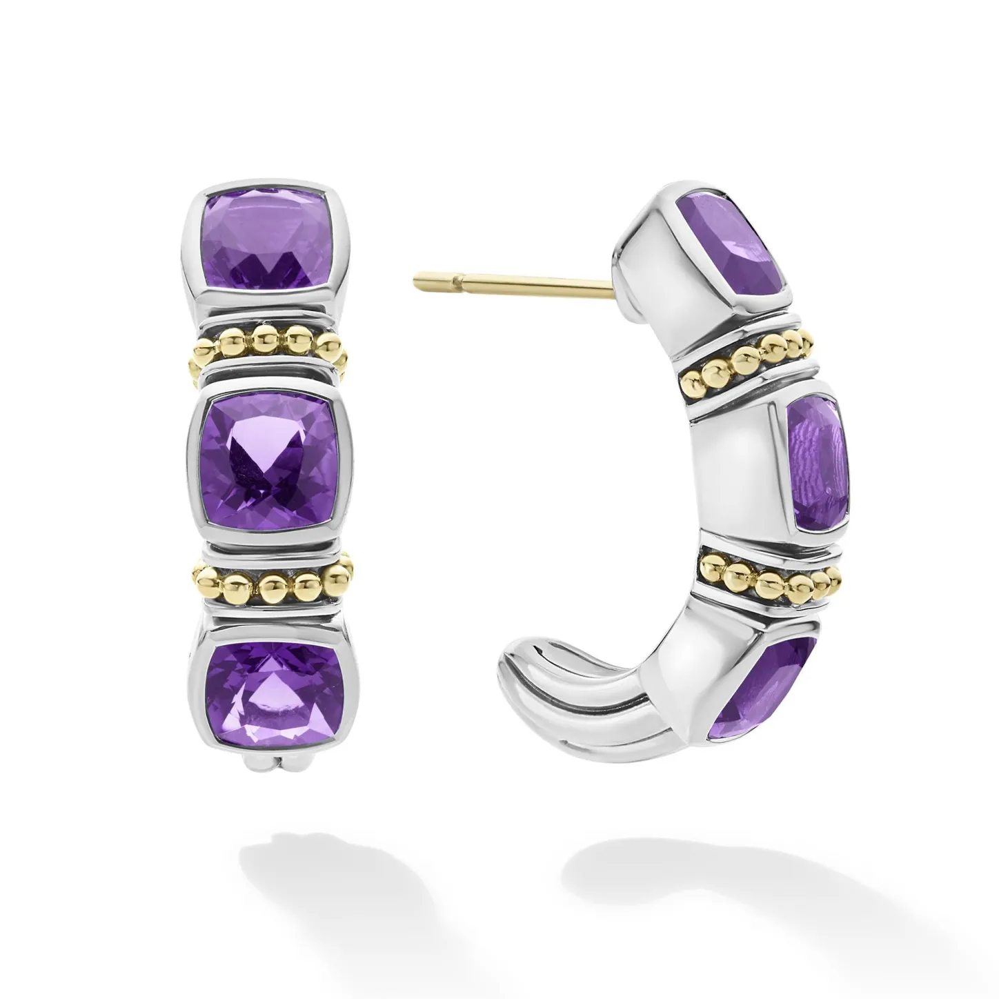 A Lagos Exclusive. Amethyst Gemstone Hoop Earrings Surrounded By Sterling Silver And 18K Gold Caviar Beading.