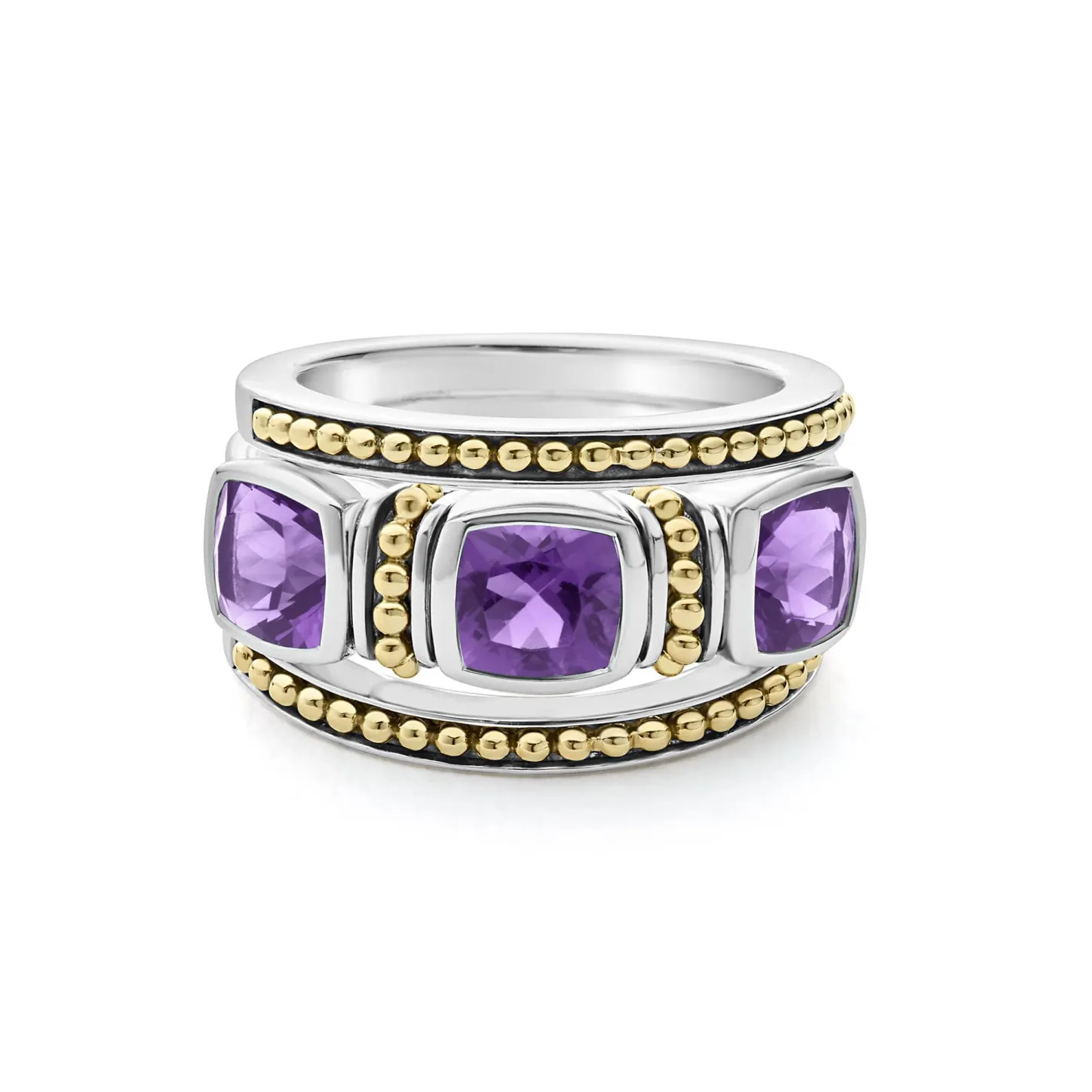 A Lagos Exclusive. A Trio Of Stacking Rings With One Amethyst Ring And Two 18K Gold Caviar Beaded Rings With Sterling Silver Accents.