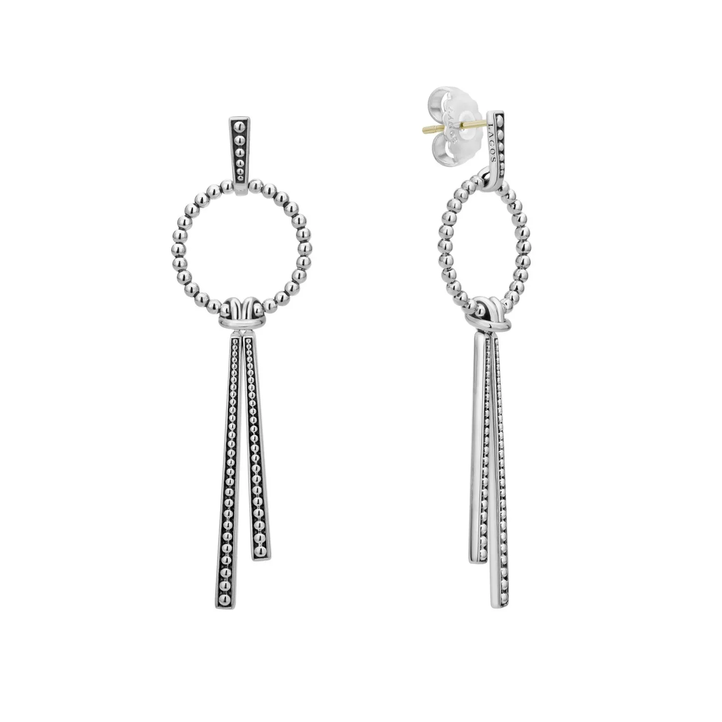 Sterling Silver Circle Drop Earrings With Two Hanging Caviar Beaded Stations.