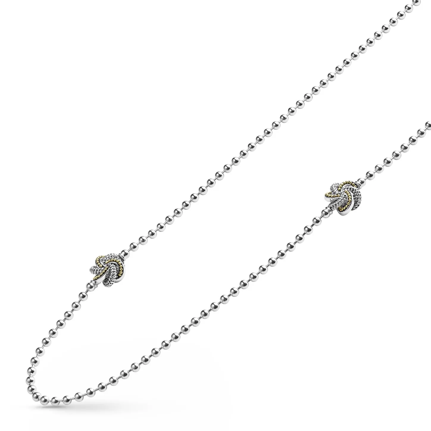 Five 18K Gold And Sterling Silver Love Knot Stations Accent This Caviar Necklace Strand.