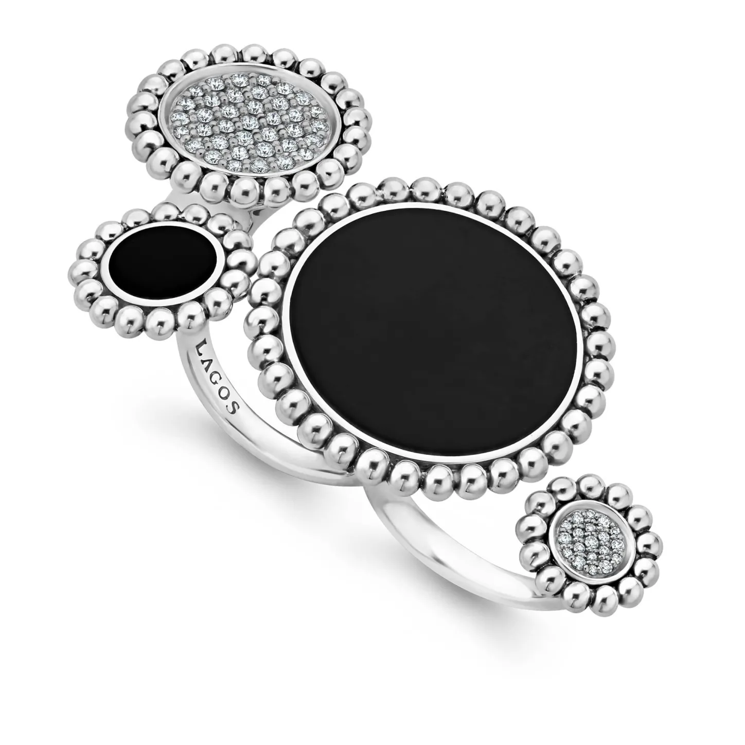 Diamond And Onyx Statement Ring With Sterling Silver Caviar Beading. Onyx Is A Natural Deep Black Stone. Lagos Diamonds Are The Highest Quality Natural Stones.