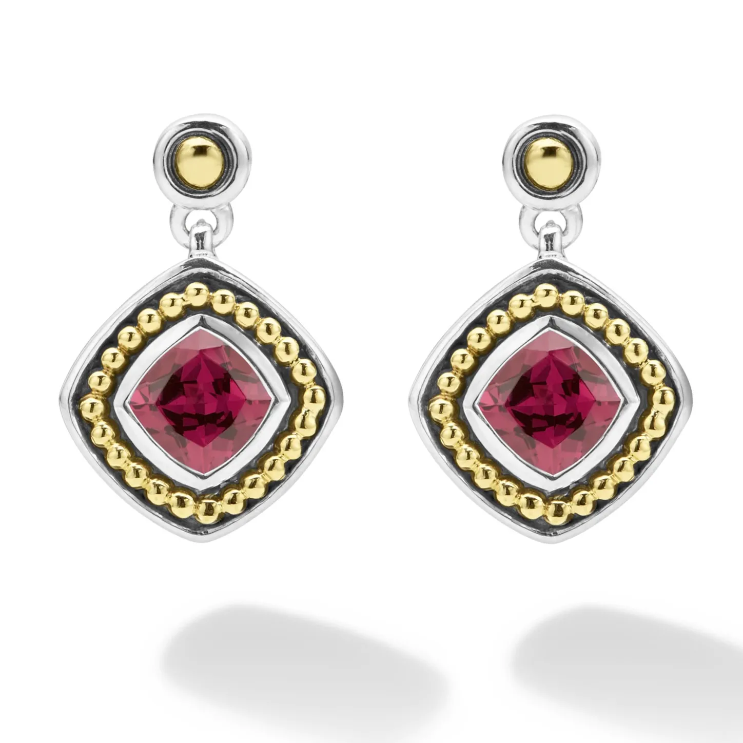 Rhodolite Garnet Gemstone Drop Earrings Surrounded By Sterling Silver And 18K Gold Caviar Beading.