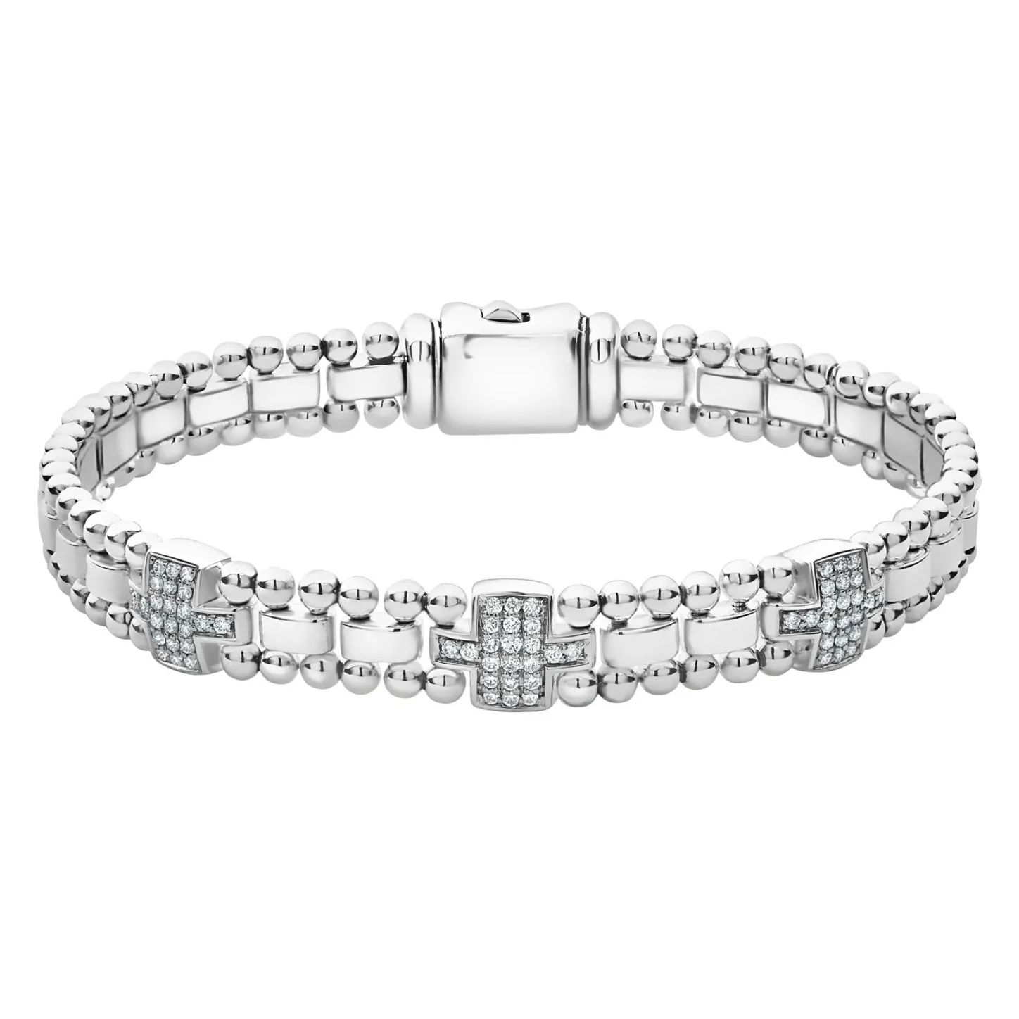 Three Pavé Diamond Stations Set By Sterling Silver Caviar Beading Form This Signature Link Bracelet. Lagos Diamonds Are The Highest Quality Natural Stones.