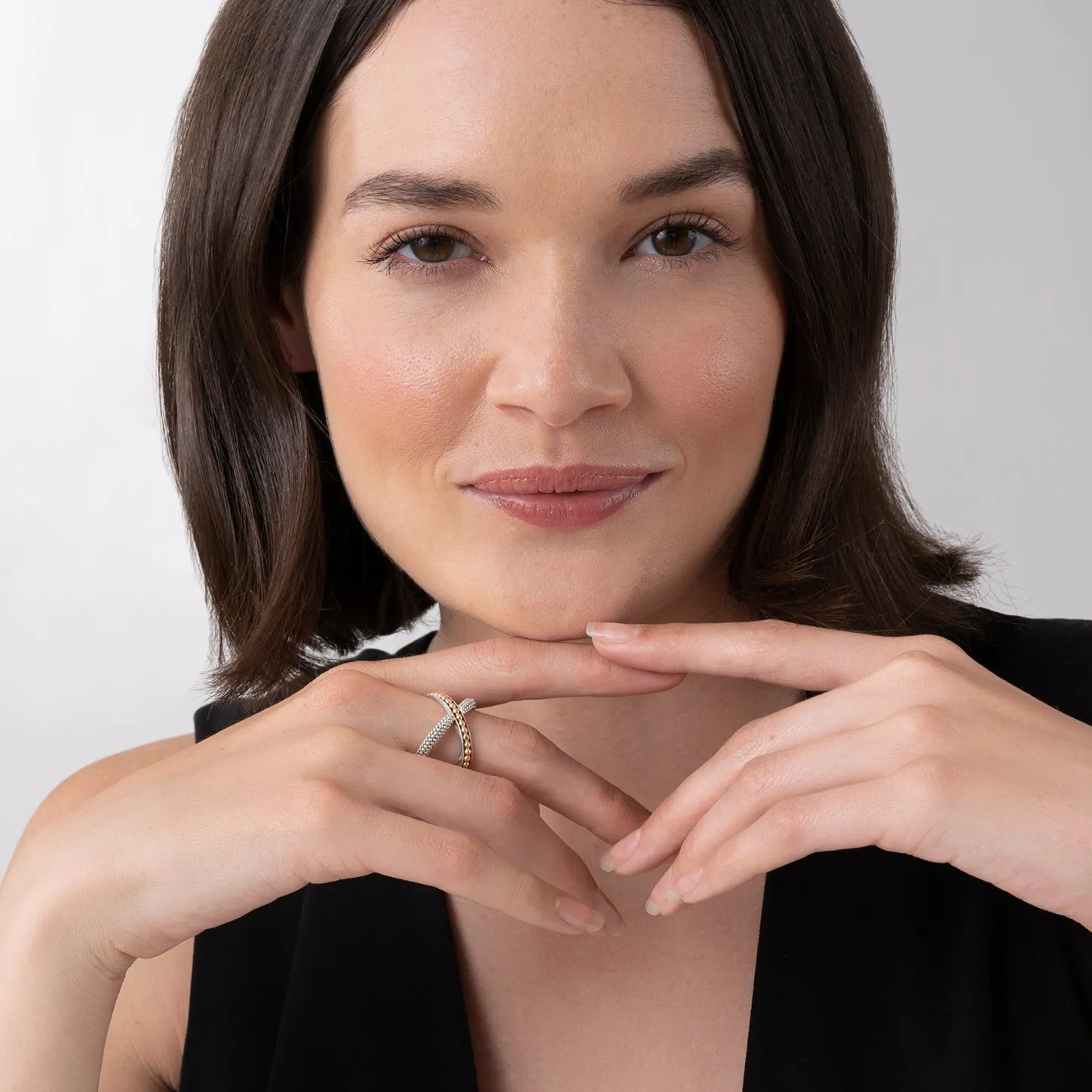 18K Gold And Our Classic Sterling Silver Caviar Beading Wrap Around Forming This Elegant X Ring.