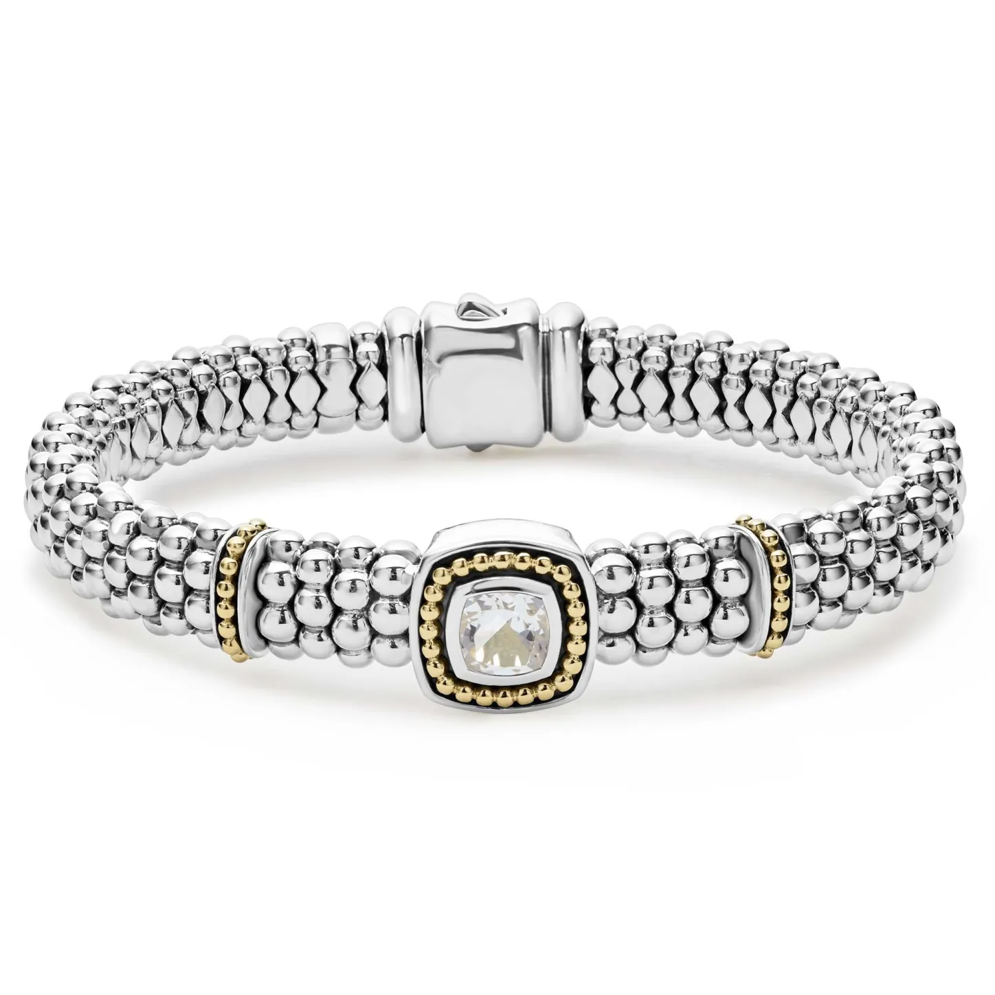 A White Topaz Gemstone And Sterling Silver Caviar Beading With 18K Gold Detailing Forms This Bracelet.