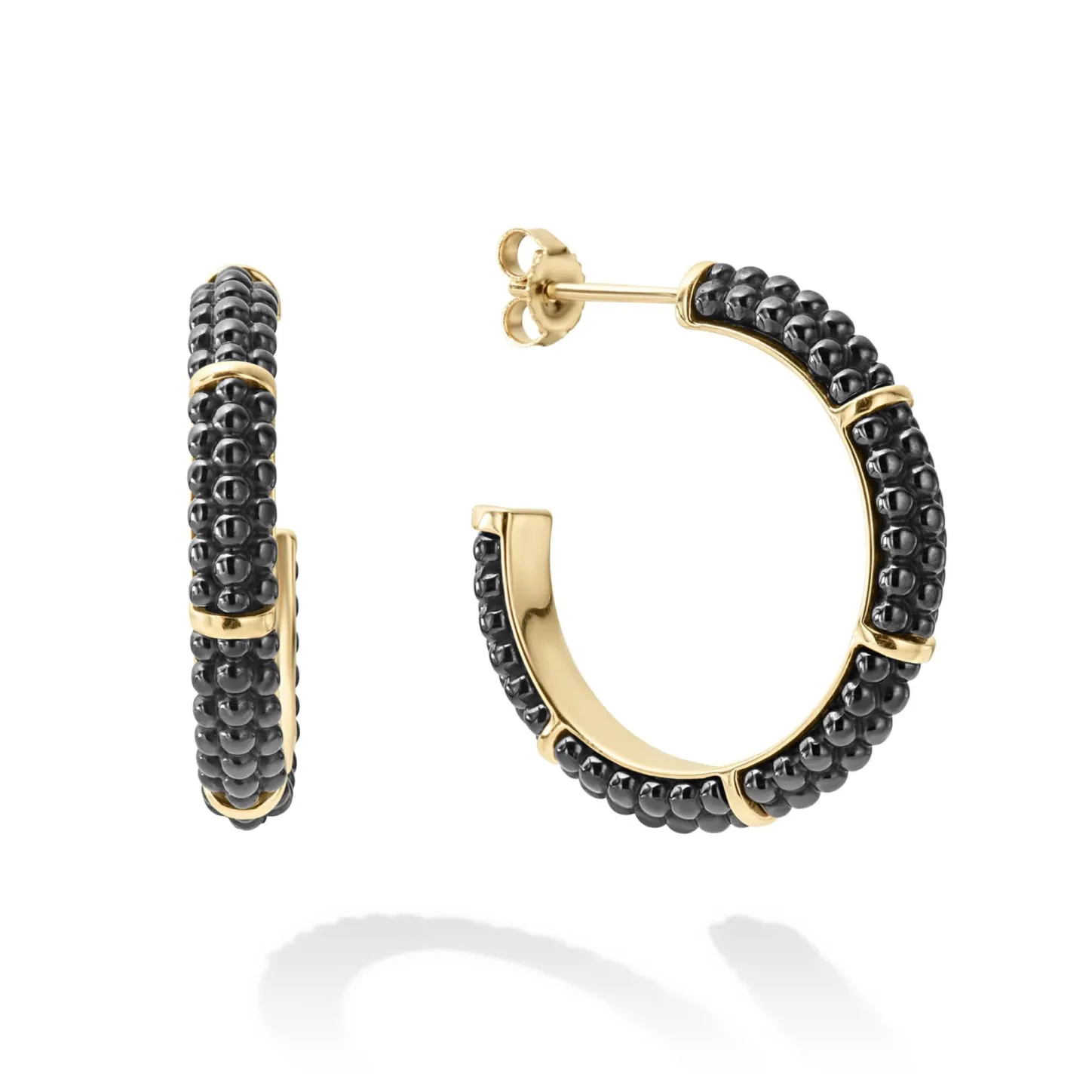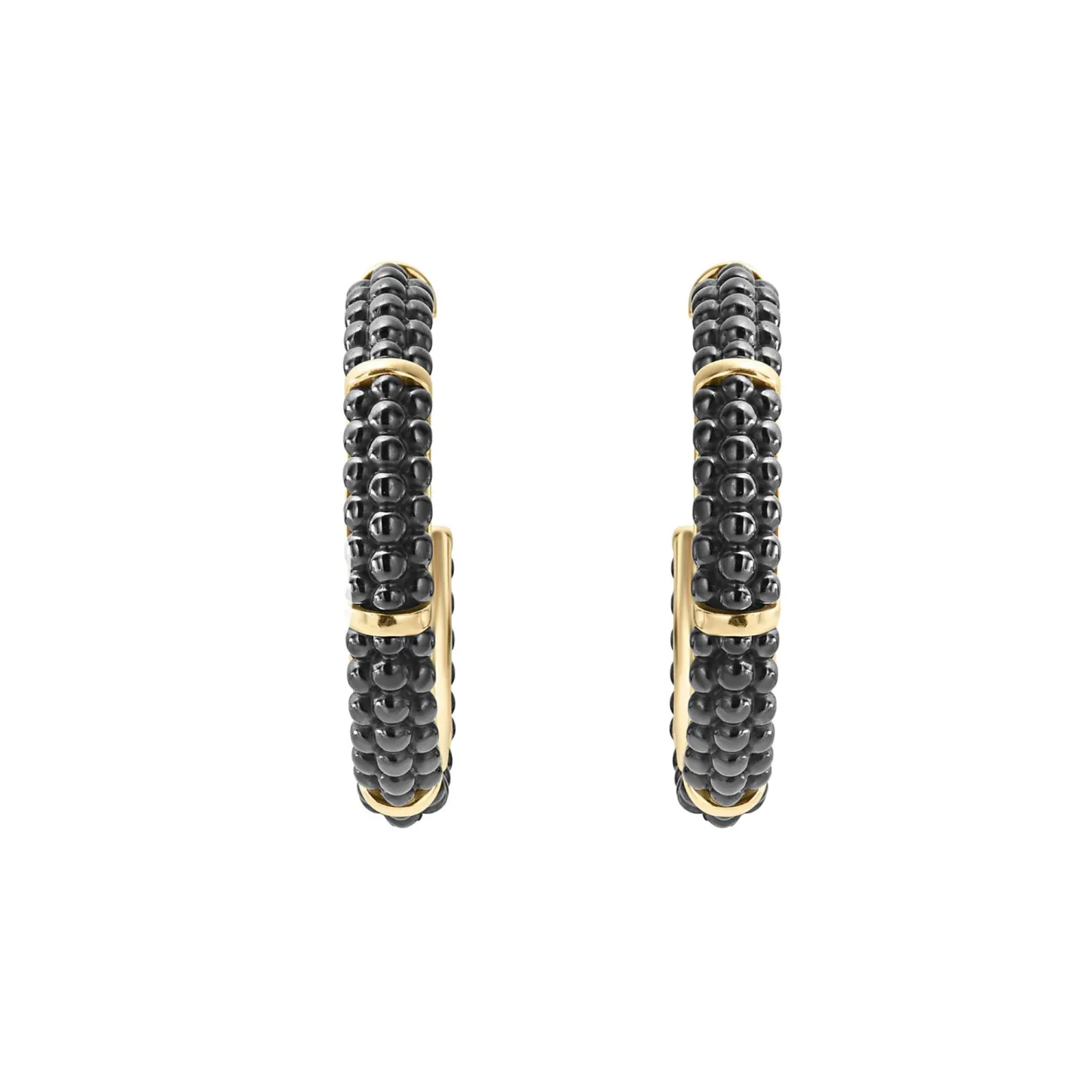 Black Ceramic Beading Highlighted By Four 18K Gold Stations Form These Hoop Earrings.