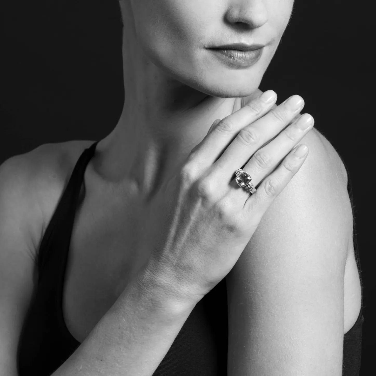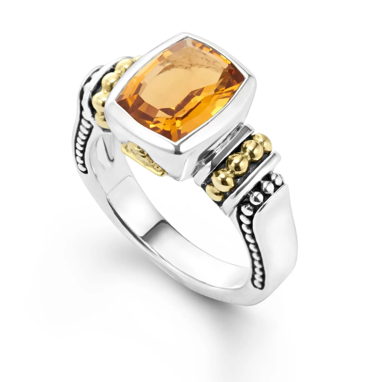 Citrine Bezel-Set Gemstone Ring With 18K Caviar Beading On A Sterling Silver Band.